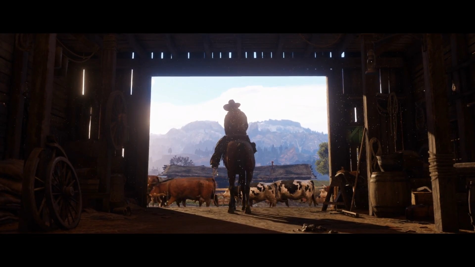 На 41й секунде трейлера можно заметить снова рогатый скот, пасущихся коров, и тут показано как главный герой садится на лошадь в сарае, смею предположить что он находится в собственном доме, или же совершенно в другой локации. Так же можно заметить частички пыли в сарае, что добавляет некой реалистичности. По сути в сарае и должна быть пыль, так уж заведено. Идём дальше