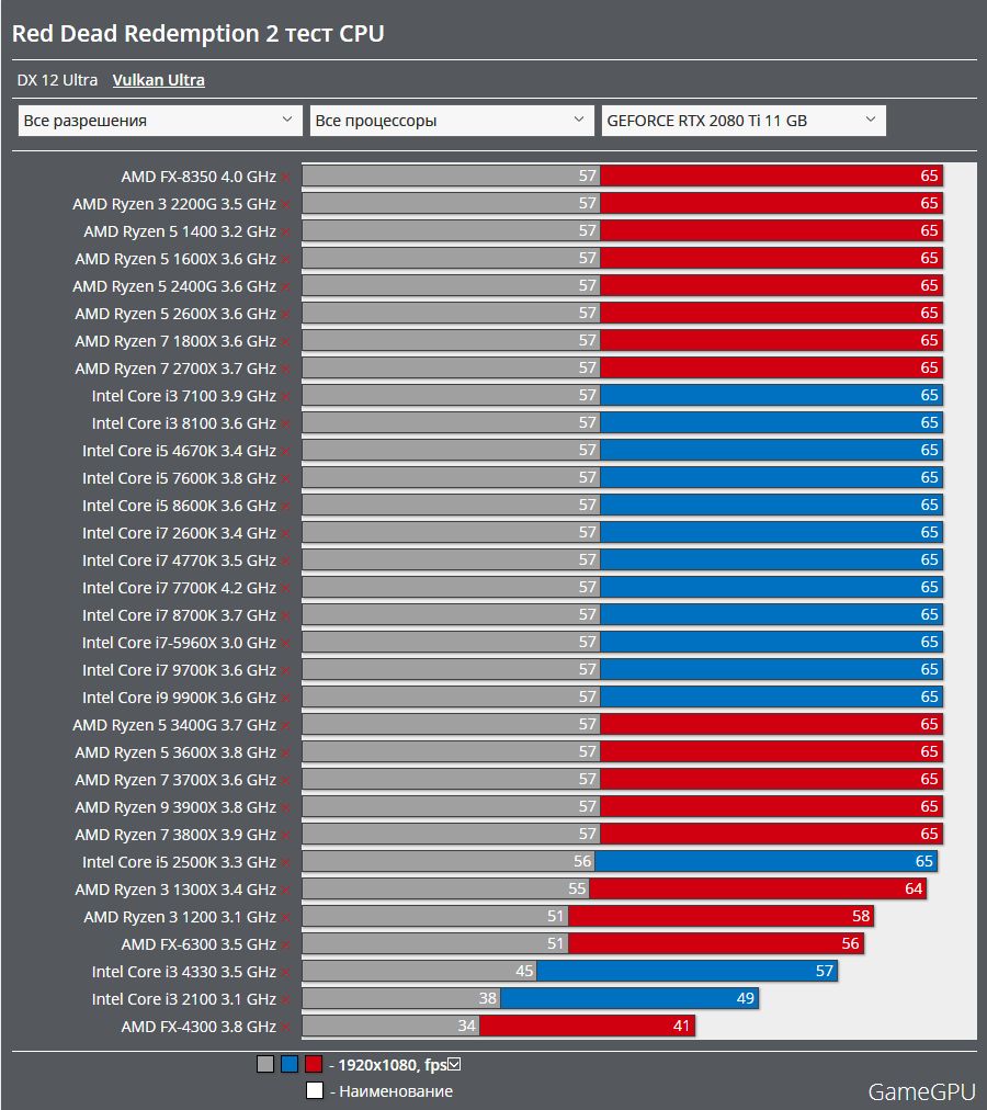 При использовании видеокарт NVIDIA приемлемый показатель не ниже 25 кадров показали процессоры FX 4300 или Core i 3 2100, и средний показатель FPS не ниже 60 кадров смогут обеспечить решения уровня Ryzen 3 2200G или Core i 3 8100.