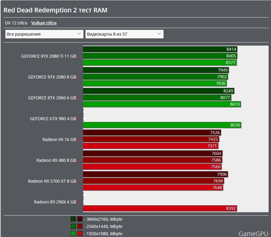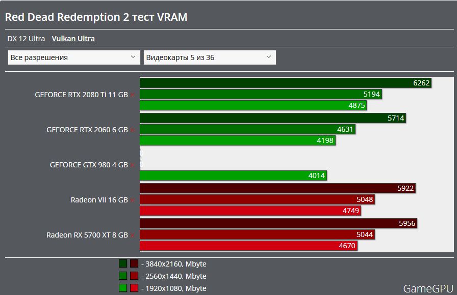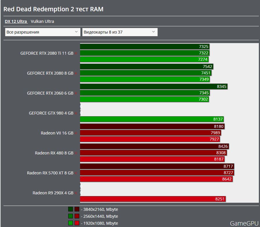 При разрешении 3840х2160 потребление видеопамяти у видеокарт с 6-ю гигабайтами 5500 мегабайт, с 8-ю гигабайит 5500 мегабайт, с 11-ю гигабайтами 6000 мегабайт и с 16-ю гигабайтами 6400 мегабайт.