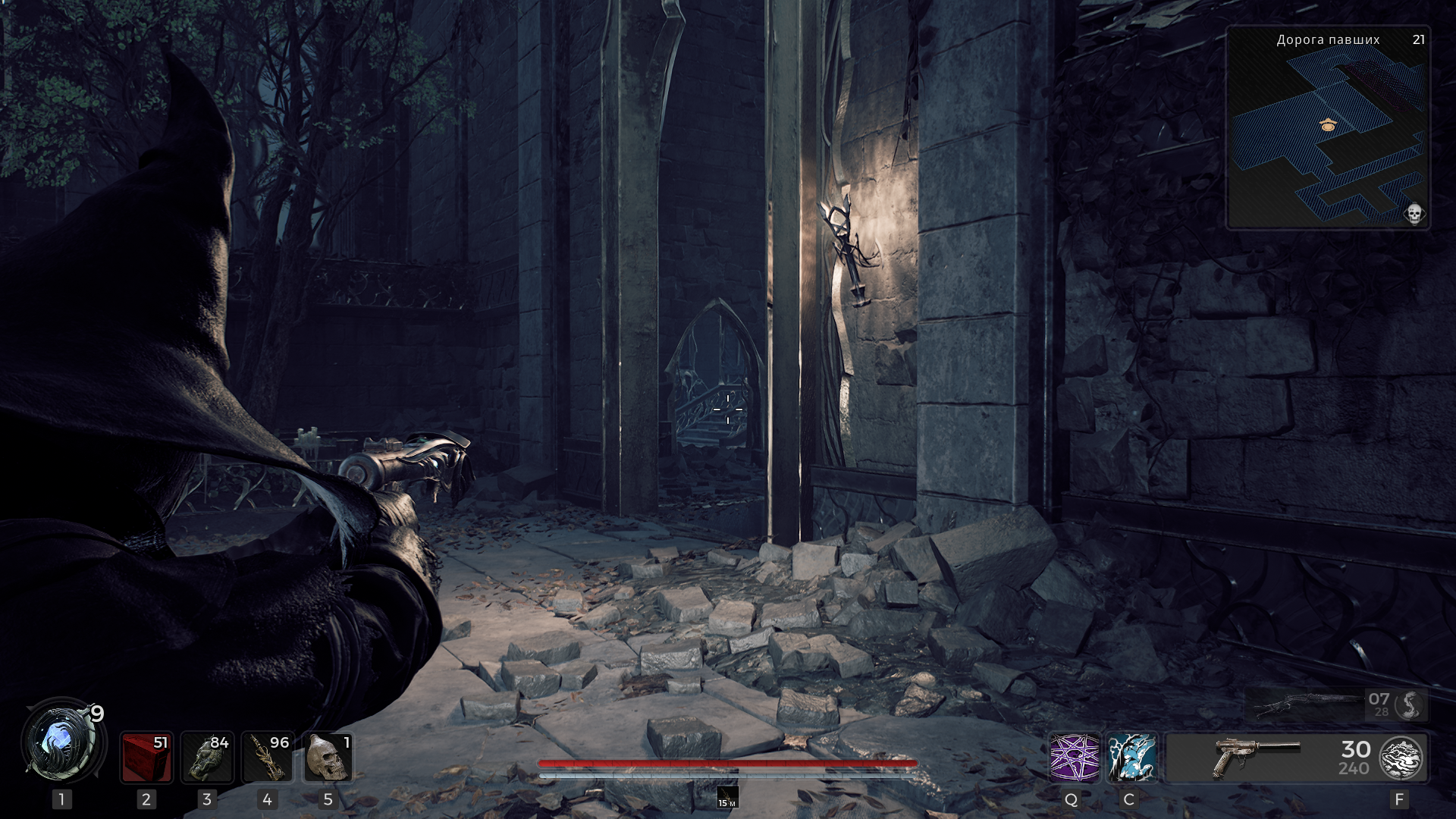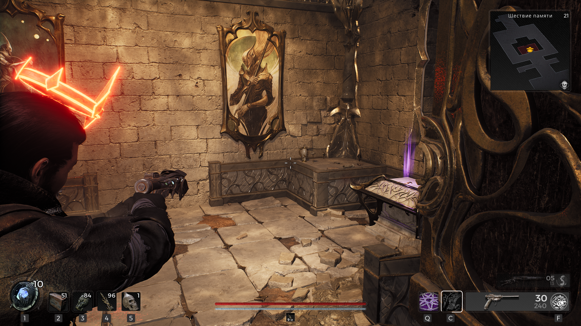 А также благодаря короне откроется тайный проход. Спускаемся вниз и забираем материал для создания модуля "Рыцарь-страж". Модуль можно создать в Блоке 13 у Маккейб. Применив модуль вы призовете два призрачных клинка, которые будут случайным образом атаковать цели. Интересный факт - Этого не указано в описании модуля, но призрачные мечи с каким-то процентом накладывают негативный эффект "Проклятие", который режет уровень здоровья врагов вплоть до 50%, в зависимости от того, сколько стаков будет наложено.