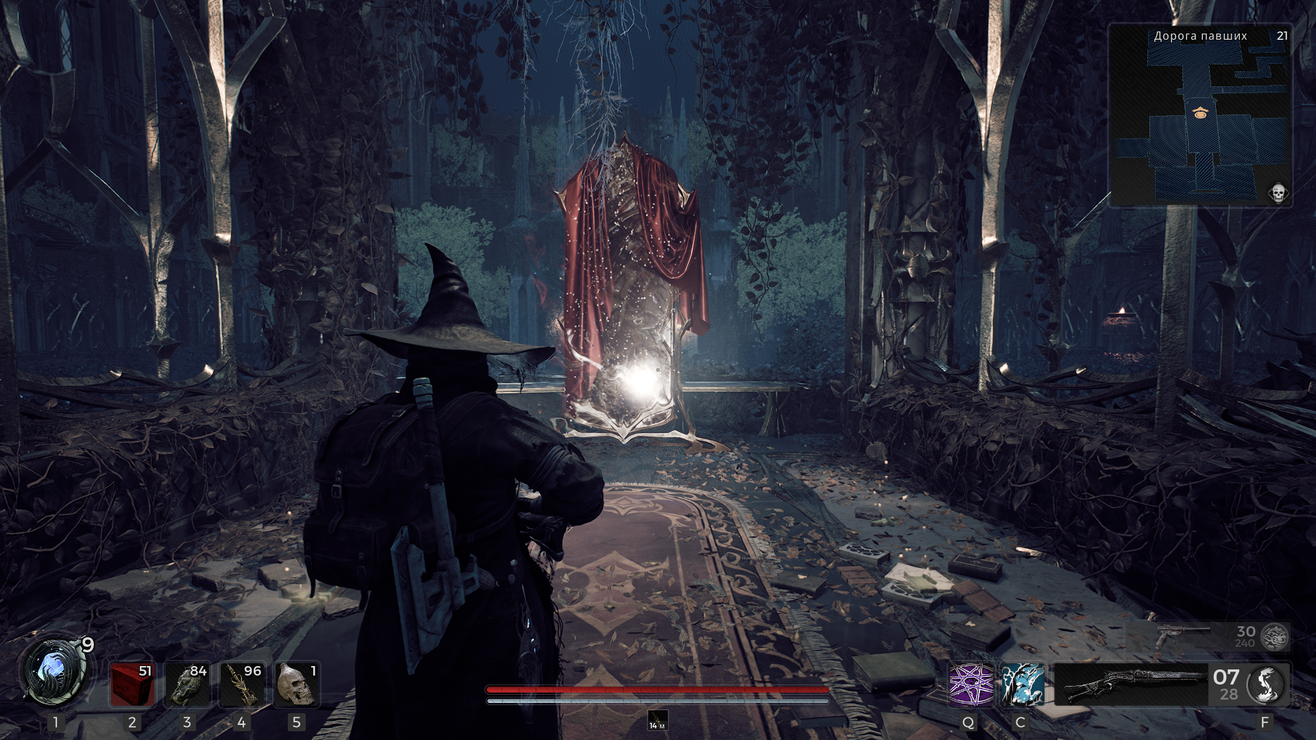 Вариант 2: В этом варианте вы сможете получить сразу две награды, но вторую только при наличии Короны Красного Принца. К сожалению, на сайте нет подробного гайда о том, как получить корону, так что если у вас ее нет, то можете подробно ознакомиться на других информационных источниках. Если корона есть в вашем инвентаре - продолжаем. Используем черное зеркало и попадаем в локацию "Шествие Памяти". Проходим чуть дальше и видим точно такое же строение с дверью, куда нужно вставить медальон. На пути будут встречаться враги. Перед тем как открыть дверь предварительно экипируем Корону Красного Принца, затем вставляем медальон. Справа на сундуке будет лежать амулет "Дар эйфории". Амулет повышает критический урон на 5% на 7 секунд за каждые истраченные 25 ед. выносливости. Суммируется до 5 раз.