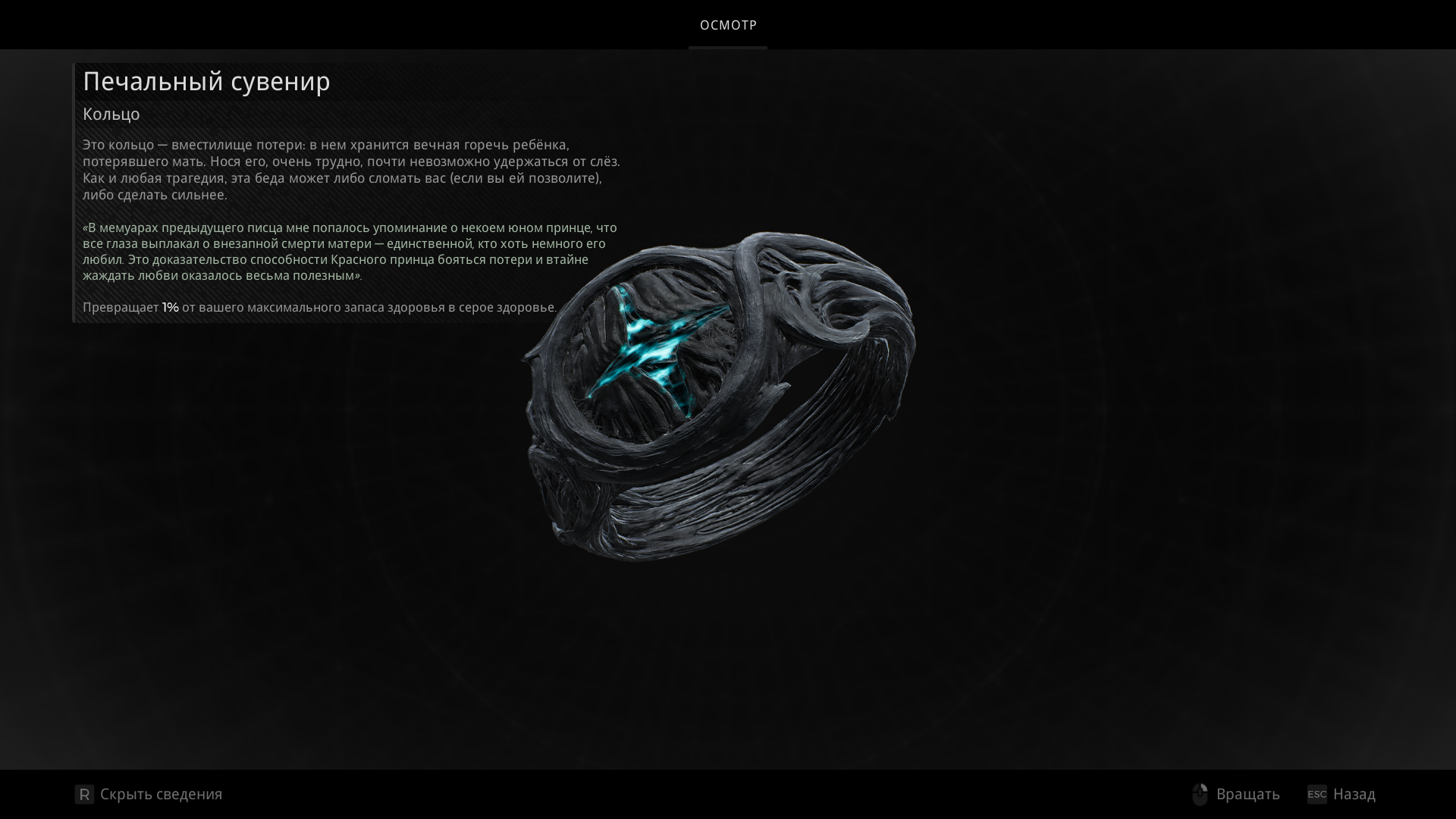 Вариант 1: После убийства мини-босса возвращаемся обратно откуда вошли в лабиринт и открываем дверь при помощи медальона. В комнате слева на сундуке будет лежать амулет "Дар меланхолии". Амулет увеличивает урон на 25% на 7 секунд при условии, что вы не будете тратить выносливость.