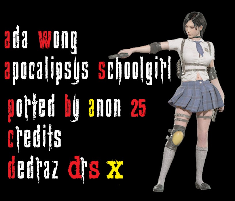 Модификация добавляет новый альтернативный наряд в игру Resident Evil 4 Remake для Ады Вонг, "AW - Apocalypse Schoolgirl". Модификация так же включает в себя следующие дополнение и патчи см-ниже.