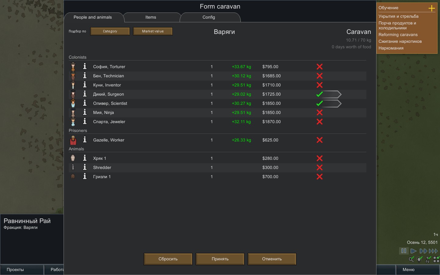 На скриншоте 3 мы видим диалоговое окно для создания каравана. Это универсальное окно, через него же можно собрать рейдовую группу десанта. Как видите, каждый поселенец добавляет переносимый вес всему каравану. Дополнительное место для вещей дает и заключенный. Также на других скриншотах вы обнаружите, что верблюды и Муффало также добавляют свои 60-70кг, как вьючные животные. Поэтому чем больше вещей вы с собой берете, тем больше людей и животных с собой нужно взять. В игру кстати добавили новый тип "походной жратвы". Она медленнее портится и экономнее расходится, требует 5 мяса и 5 растительного ресурса. Однако не дает никакого удовольствия. Для путешествий - самое то. А то за неделю ваши вкусные блюда все испортятся в дороге.