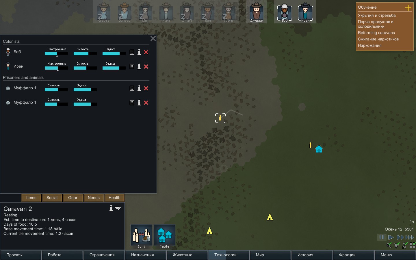 Также по умолчанию вам разрешено иметь только одно поселение. Однако в настройках можно изменить этот параметр и тогда ваши караваны смогут основывать новые поселения где захотят. Это же можно сделать и не меняя настроек. Просто собираете всех жителей своего поселения и отправляете их в путь, затем нажимаете на своем поселении "Оставить" и бац. Вы уже можете основать новое поселение в новой местности со всеми припасами и прокаченными персами. Не нужно даже начинать игру с начала.