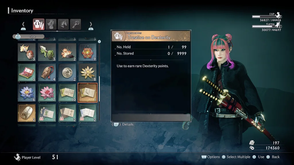 Система прокачки в игре может показаться запутанной даже несмотря на обучающие материалы. В Rise of the Ronin существуют два типа очков навыков: обычные и редкие. Обычные очки навыков зарабатываются за убийство врагов, а также за укрепление связей с союзниками и регионами. Это даёт опыт (или Карму), который затем можно обменивать на очки навыков у Знамён Тумана.
