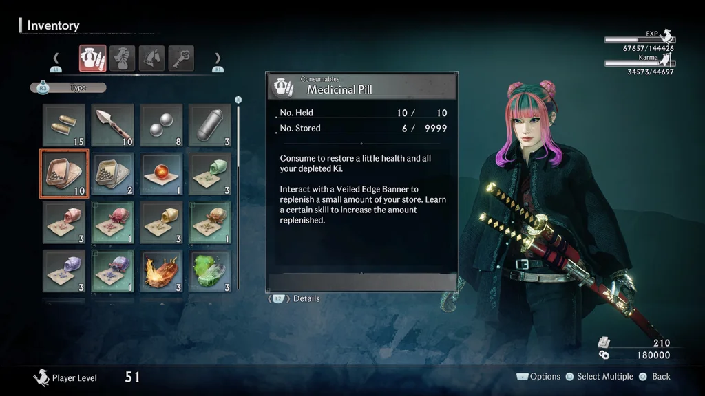 - Лечебные пилюли восстанавливают небольшое количество здоровья и полностью восполняют Ки. Их можно найти, побеждая врагов или открывая сундуки. Максимально можно носить 10 штук, но после смерти или отдыха у Знамён Тумана вы получите только 3. Этот минимум можно увеличить, прокачав определённые навыки.