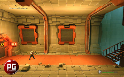 Уровень начинается со встречи с придателем, который "натравливает" на нас двух своих подопечных. Расправляемся с ними. Идем вперед до двери, которая оказывается закрытой. Открываем люк сверху и запрыгиваем в него. Пробегаемся по этажам, попутной убивая неприятелей. Дойдя до очередной двери, которая тоже закрыта, хватаем бластер под красным силовым полем и вставляем его в гнездо над дверью. Дверь открывается, заходим и спускаемся на лифте вниз. Далее идем вправо до двери. Убив двух врагов, вновь же спускаемся на очередном лифте вниз. Проходим в дверь слева. Будьте осторожны, врагов становится все больше и больше! Спускаемся вниз на движущейся платформе, и снова вниз, только уже по лестнице. Забравшись на несколько платформ, направляем луч лазера как можно правее, чтобы он попал на платформу, которая выше. После этого бежим по нижней платформе до двери. Немного пройдя, забираемся на самую высокую "точку", прыгая по контейнерам, из которых высыпается земля. Проходим вперед до лестницы и вставляем бластер в гнездо, тем самым активируя движение второй партии контейнеров с землей. Залезаем на них, и продвигаемся к очередной двери. Войдя в комнату, открываем оба люка, берем бластер снизу, проходим через желтое защитное поле и встявляем его в гнездо. Активируется лазер. Направляем его луч в ящики слева, тем самым разрушаем их. Путь открыт и мы можем двигаться дальше! Держим путь к очередной двери, попутно уничтожая неприятелей. Зайдя в дверь Вы увидите несколько сдавливающих механизмов. Осторожно проходим, не попав под пресс (опускается каждые 5 секунд, так что медлить нельзя :)). Пройдя опасный участок, залезем наверх по лестнице. Немного проходим вперед, накроняем на себя обружившийся мост и залезаем на него и бежим до очередной двери. Попадаем в комнату с аппаратом, где можно улучшить свой G-lifter. Теперь Вы можете кидать гранаты (Detonator) нажатием клавиши "G" или колесика мыши. Возвращаемся назад и заходим в ту дверь, что чуть пониже. Кидаем гранату на пол (место куда кидать подсвечивается, так что найдете :)), и падаем в образовавшуюся яму. Попадаем в туннель и идем до двери. Часть 4 закончена.