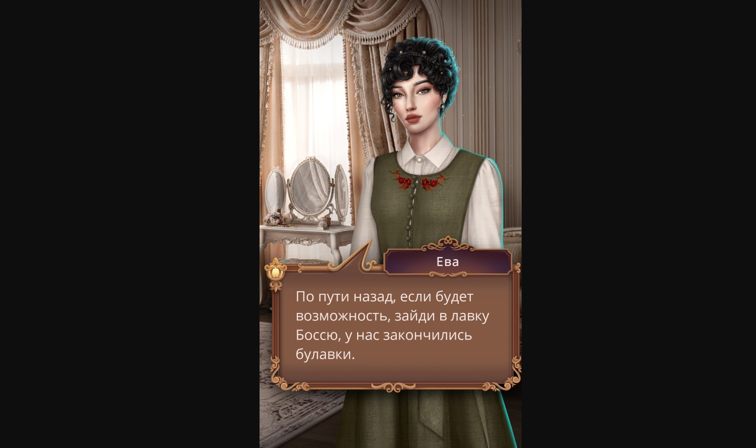 Затраты алмазов на серию: 44 - польстить Еве, 0/44/105/134 - наряд, 0/23/26/44 - прически, 26 - сдерзить Александру, 0/8/23/28 - перчатки.