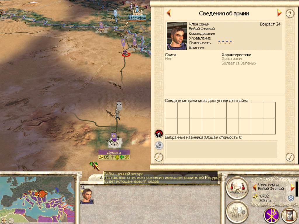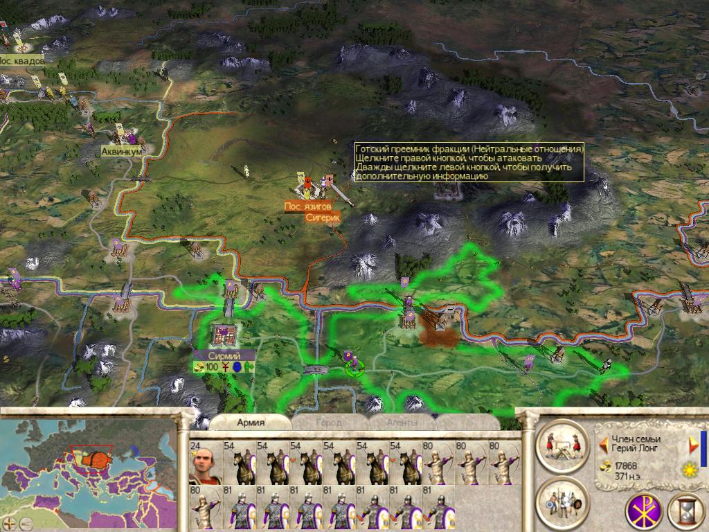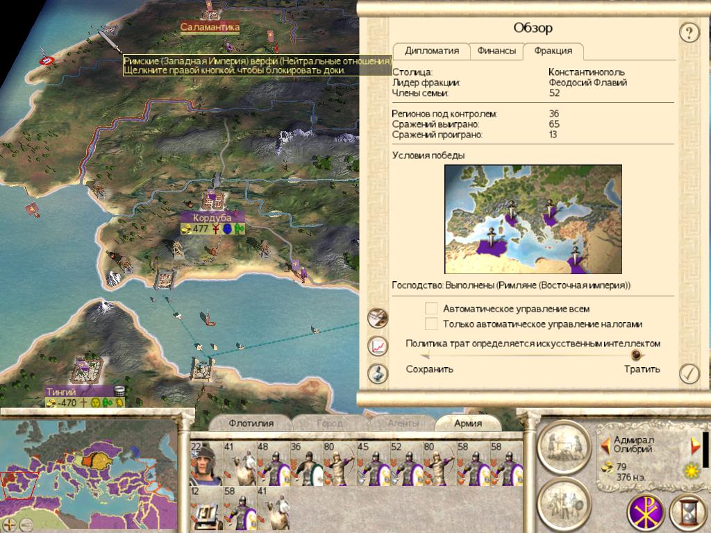 Основной моей целью было, захватить территорию ЗРИ: Италию, острова, Африку и Испанию и продвигается к Галлии и Британским островам. Поскольку это значительно усилит мое финансовое положение. Я собрал все дееспособные отряды, тыл оставил крестьянам даже территория Египта, Греции и Фракии, и двинул эти силы на Западную Римскую Империю. Финансы первого хода там, где это было необходимо, я потратил на казармы легионеров, церкви, и крестьян. Не испытывал проблем с восстаниями за все время.