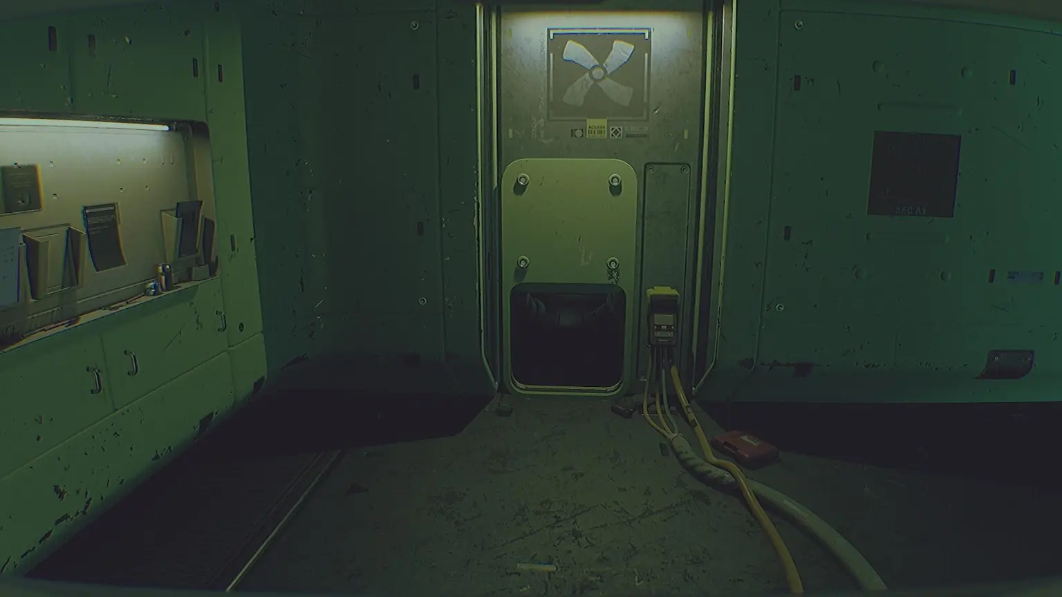 Теперь, вооружившись Ультразрением, можно приступать к эвакуации. Покинув магазин электроники, нужно вернуться в главный коридор. Через три левых поворота находится выход, но его ворота закрыты. Справа, у терминала обслуживания, висит записка. Используя сканер для подбора кода, откройте ставни в техпомещение. Внутри, высунувшись из окна, расстреляйте блок предохранителей.