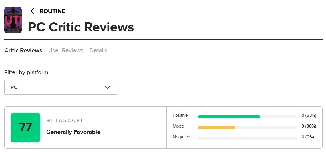 «Там где Routine не хватает количества, она с лихвой компенсирует ошеломляющим качеством. Это кассетный футуризм в самой осязаемой форме, с визуальным стилем, которому соответствует только новизна её CAT-инструментария. Lunar Software поднимает планку звукового дизайна, создавая уникальный опыт для поклонников научно-фантастического хоррора».