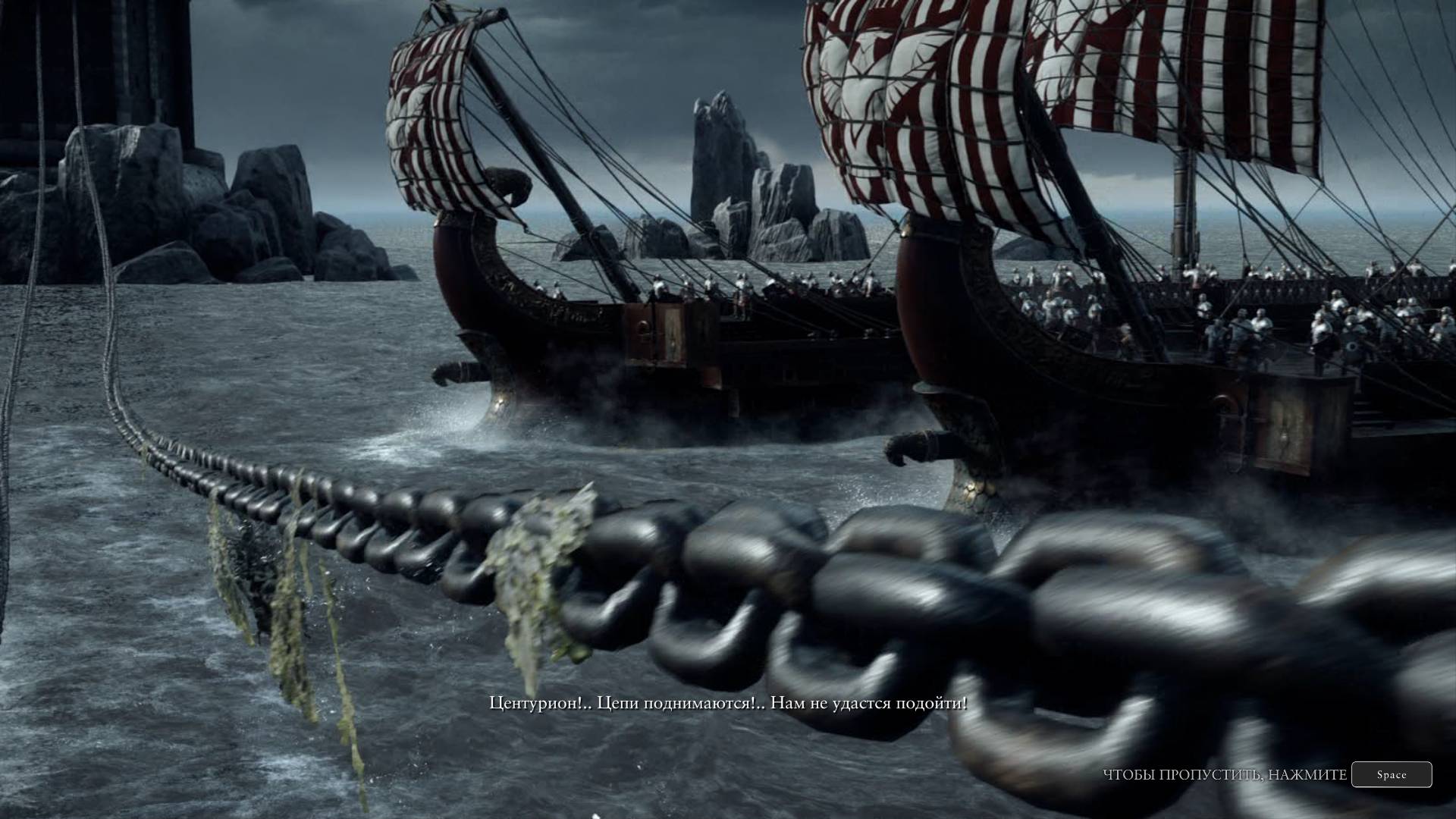 Далее подходим к флагу и призываем солдат построиться в фигуру черепахи. Идём вперёд, вовремя прикрываясь щитами, прорываемся в башню. Внутри башни нам нужно отпустить цепи. Поднимаемся наверх и открываем два цепных замка, варвары будут мешать вам это сделать. После этого вам нужно защищать ваших людей от лучников, пока они опускают цепи. Наконец цепи опущены и башня уничтожена. Теперь римская армия перегруппировывается и атакует берег.