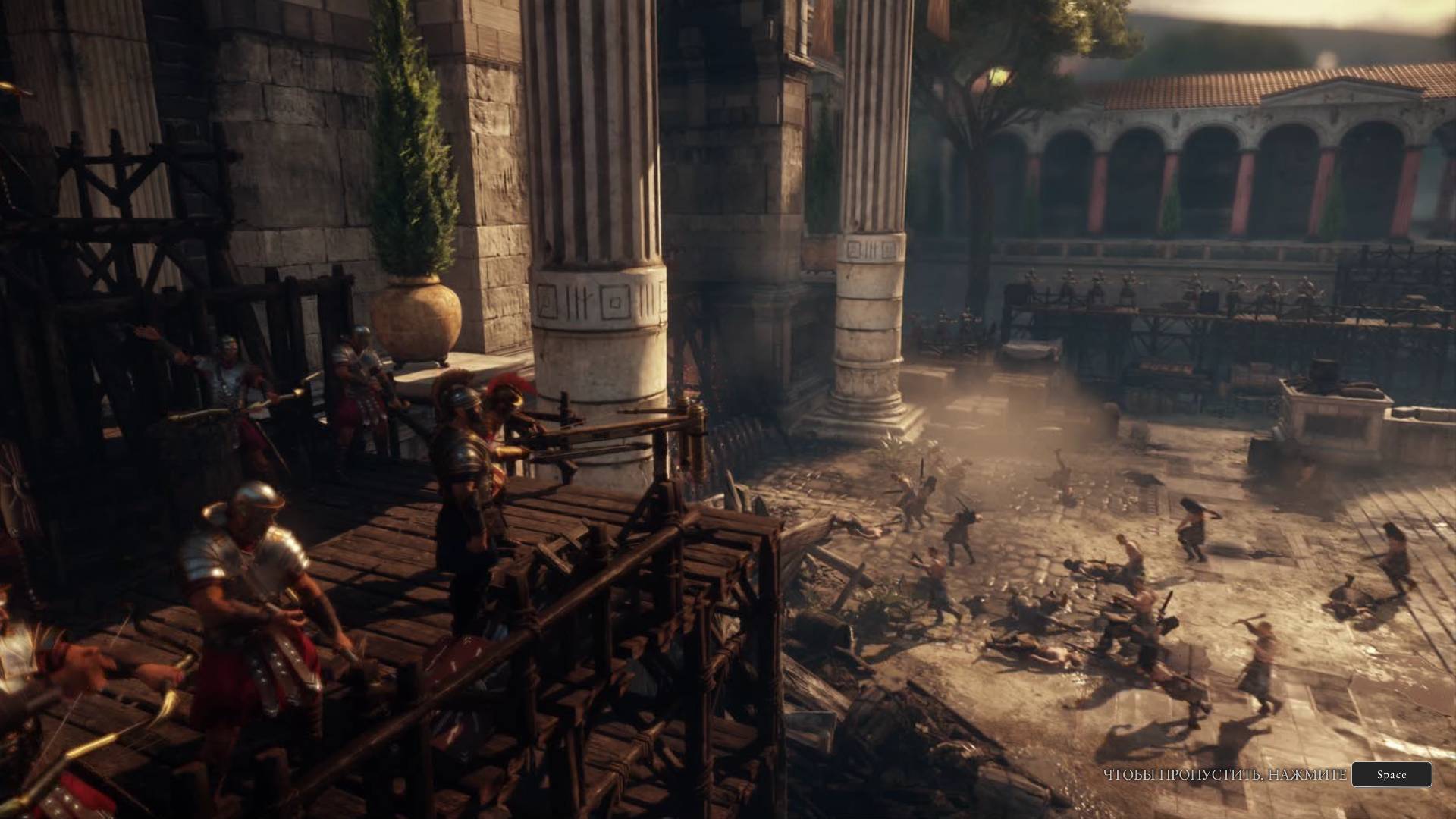 Следуем вперёд за Леонтием, убивая врагов на пути, далее нам нужно добраться до амфитеатра и встретиться с человеком Леонтия, Платием. Подымаемся по строительным лесам, следуем вперёд, разбивая препятствия мечом (подсвечиваются синим). Дойдя до амфитеатра, наблюдаем смерть Платия. Наша задача - убить лучников, осадивших амфитеатр, хватаем пилумы и поочерёдно метаем их в лучников (LT приметиться, RT стрелять).