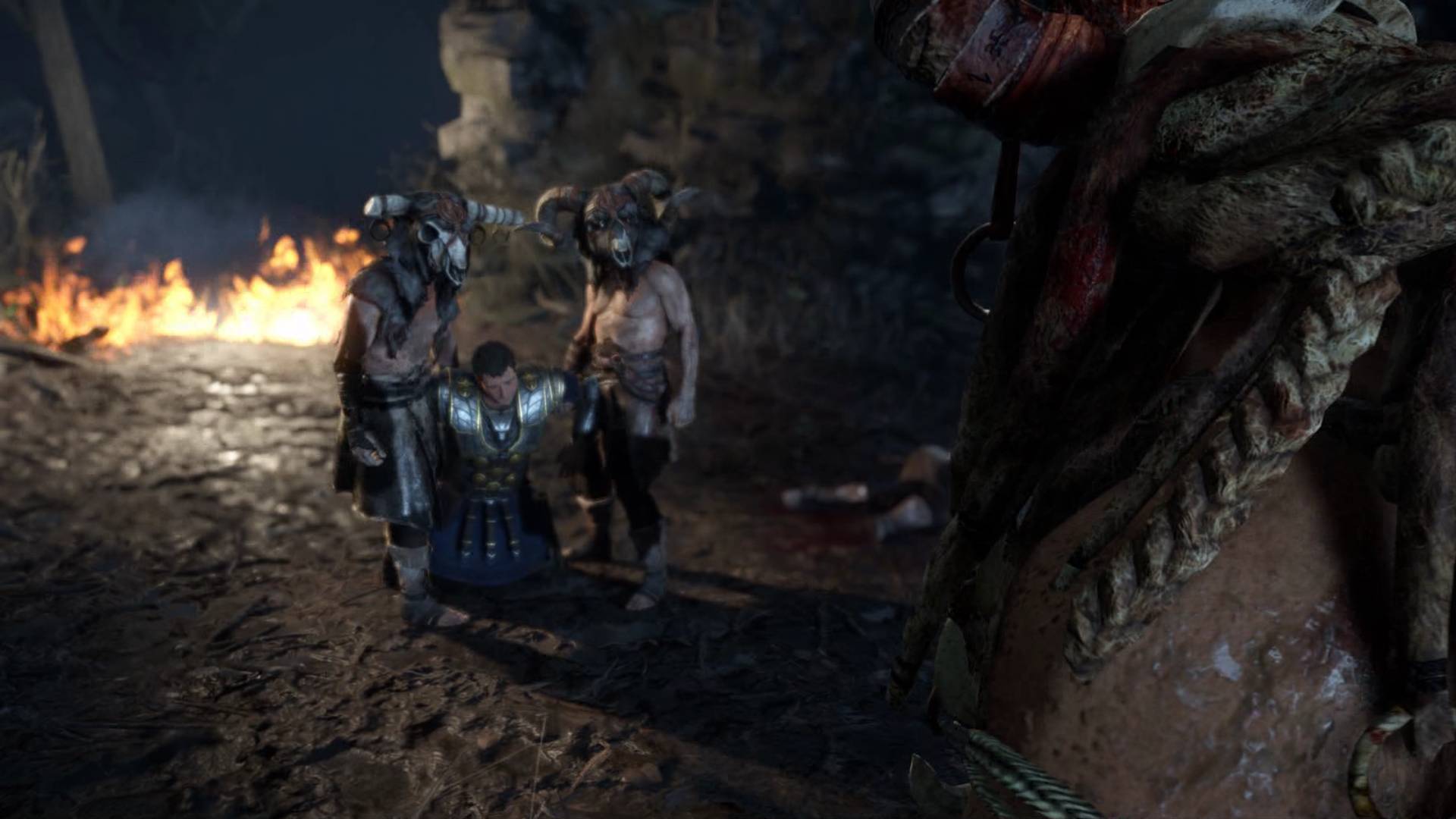 Идём вперёд, на свет. Там видим, как рогатые сжигают клетки с солдатами, спускаемся к ним и режем их, защищайте клетки от рогатого с факелом, не дайте ему поджечь остальные клетки. Отбившись от рогатых и освободив солдат, идём вперёд к чучелу. Чучело охраняет вождь рогатых, Глотт. Бой с ним похож на бой со громилой с молотом, но только до половины его здоровья, дальше он будет наносить удары с разгона, ваша задача - отбить его удар с разбега, если он готовится к бегу, раскинув руки, то приготовьтесь нажать кнопку щита, а если нет, то приготовьтесь отпрыгивать. Удачно контратаковав удар с разбега, бьём его, и так несколько раз. Убив Глота, освобождаем Виталиона и ворчащего из клетки Коммода.