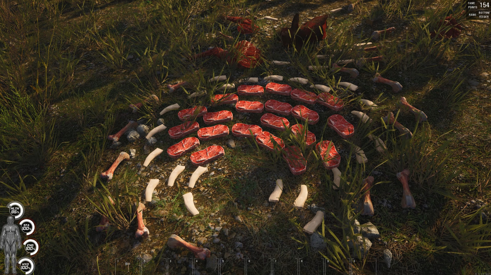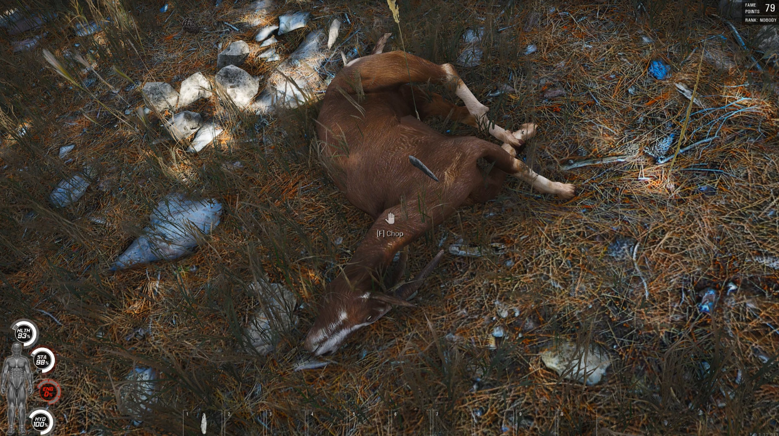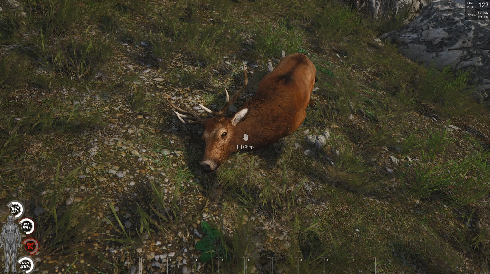 Скам не хотел хавать ее сырой и он решил создать костер. Чтобы создать костер нужны: камни, полено и веревки. Полено получают от вырубки дерева, а для этого нужен топор (камень, деревянная палка и веревка). Для веревки нужны: деревянная палка, нож и т.д. Скам не знал что для создания костра нужно пройти 7 кругов ада. Создав костер он хотел зажарить козу, но ее туша куда-то пропала (точно баг). Охуеванию Скама не было предела:"Твою мать... козза!" К счастью невдалеке он заметил оленя и начал свою охоту. Скам потратил 20 минут чтобы убить этого оленя и пришлось бежать за ним до берега.