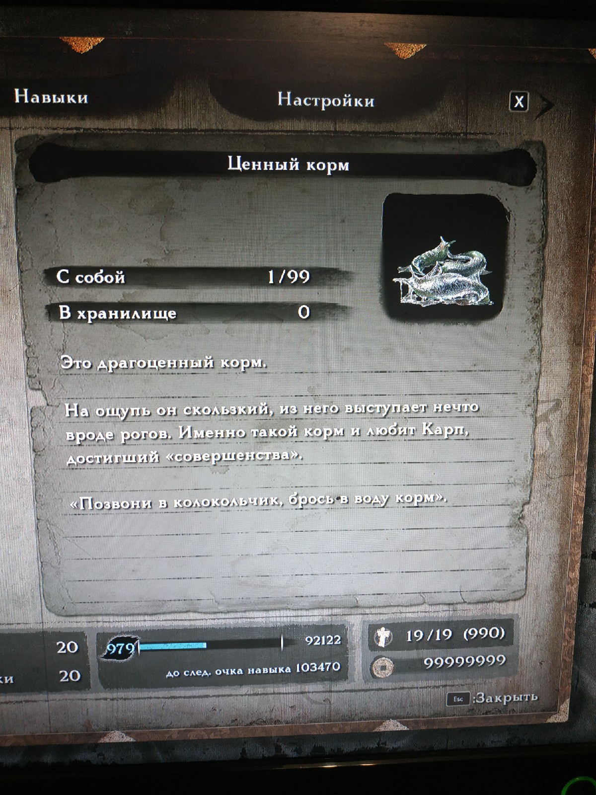 наверное что бы приманить Великого карпа, за кормешку дали 4 чешуи. я хз как его убить, он плавает в одном и том же месте в подводной пещере через которую попадаешь во дворец