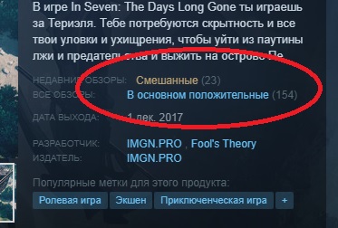 На текущий момент, согласно информации аналитического сервиса SteamSpy, игру приобрело чуть менее десяти тысяч пользователей. Стоит отметить, что свыше 90% покупателей приобрело Seven ещё в прошлом году, что говорит о катастрофическом падении продаж.