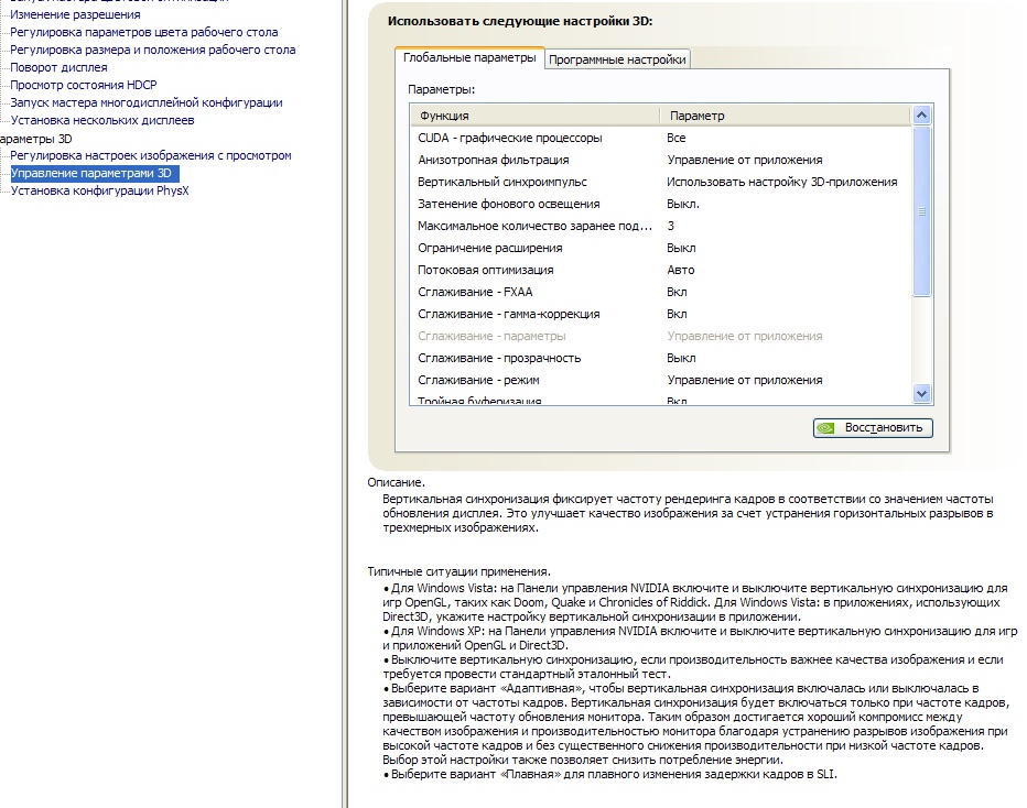 У меня монитор LGсинема 3Д,очки черезстрочные в комплекте,как уже говорил,в Крайзис второй и в Аватар,прекрасно в стерео играл.Там в меню игры настройки стерео включал,без проблем.И пакет дров вроде скачан...В панели управления Нвидиа вторая ссылка снизу-управление параметрами 3Д,Дальше глобальные параметры и програмные настройки.Так вот ЧТО ИМЕННО там надо включить ,или какие параметры настроить???Там же нет кнопки-"включить стереорежим")))