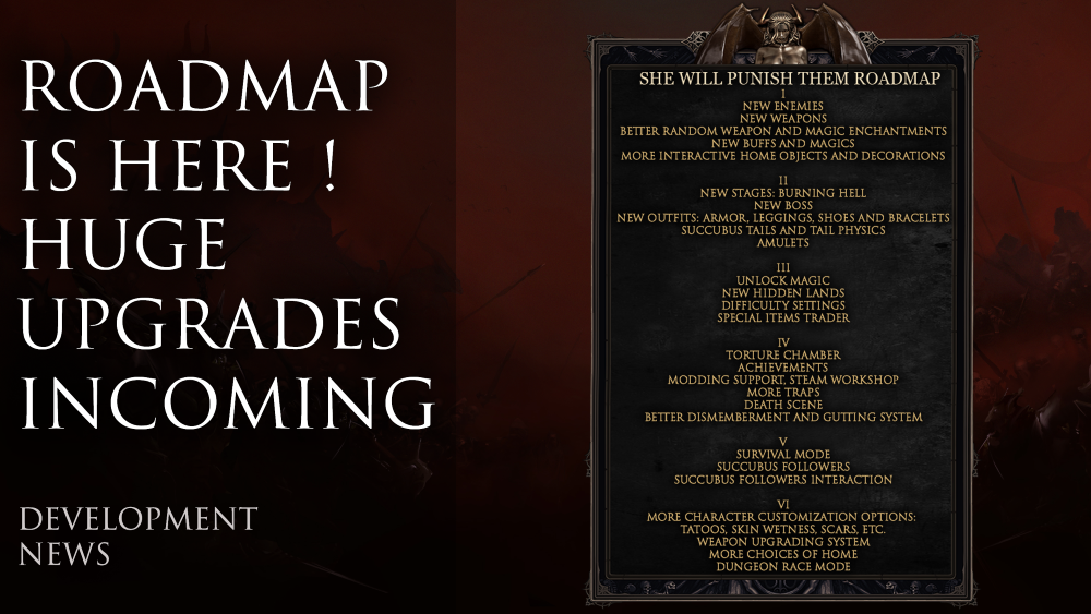 Студия L2 Game Studios поделилась планом развития своего проекта She Will Punish Them. Разработчики планируют добавить в игру много нового контента: новых врагов, нового босса, новое оружие, новые уровни, новые наряды, новые режимы, улучшить редактор создания персонажа, добавить достижения, добавить поддержку модов и многое другое.