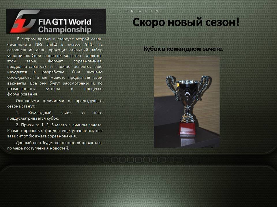 Приглашаю всех принять участие в чемпионате по игре NFS Shift2. Основная часть чемпионата будет проходить в классе GT1, будут еще второстепенные классы. Победители будут награждаться реальными призами: в личном зачете - денежный приз, в командном - кубок!!! Спешите!! Старт через 2 недели. По вопросам участия пишите в личку.