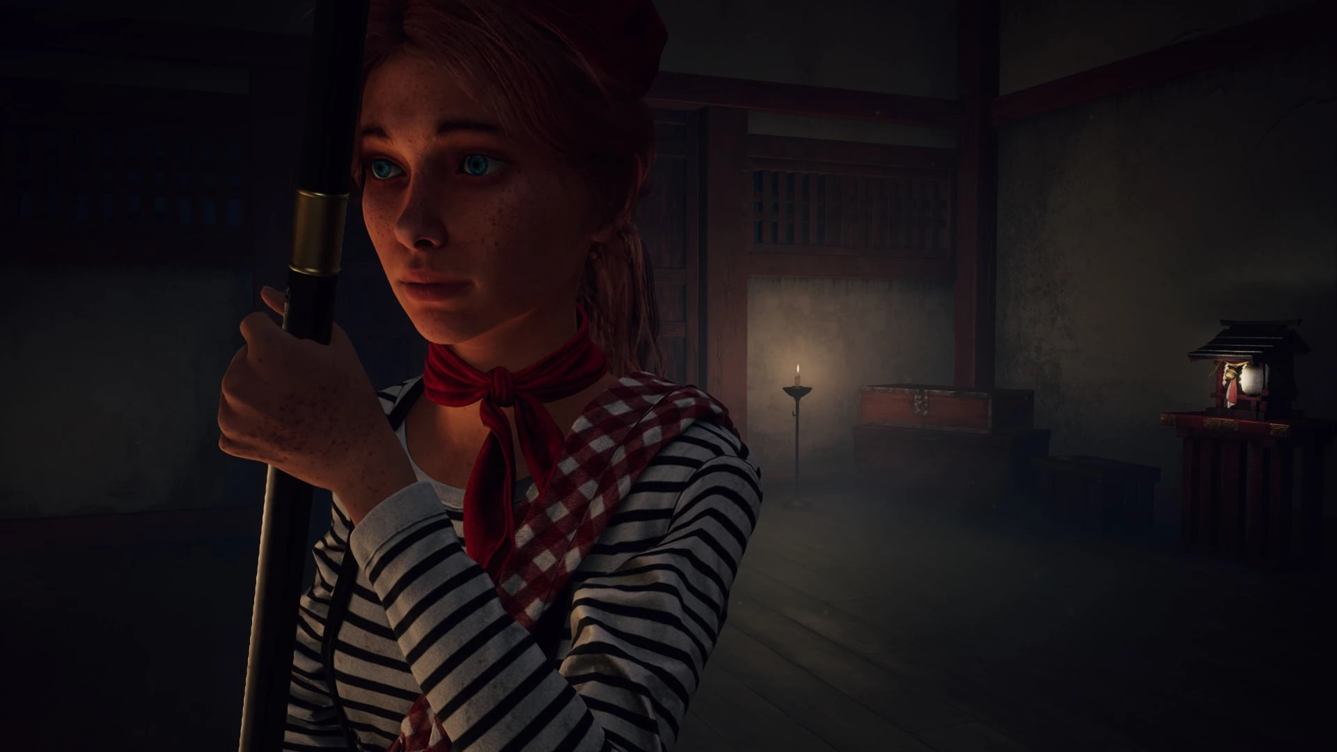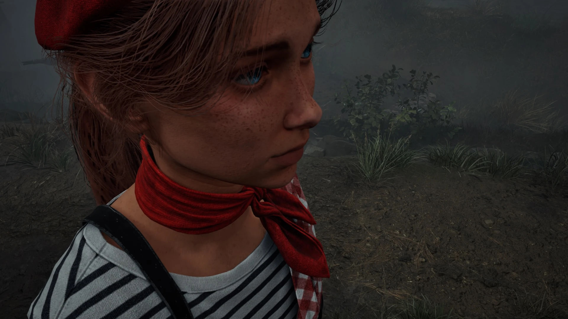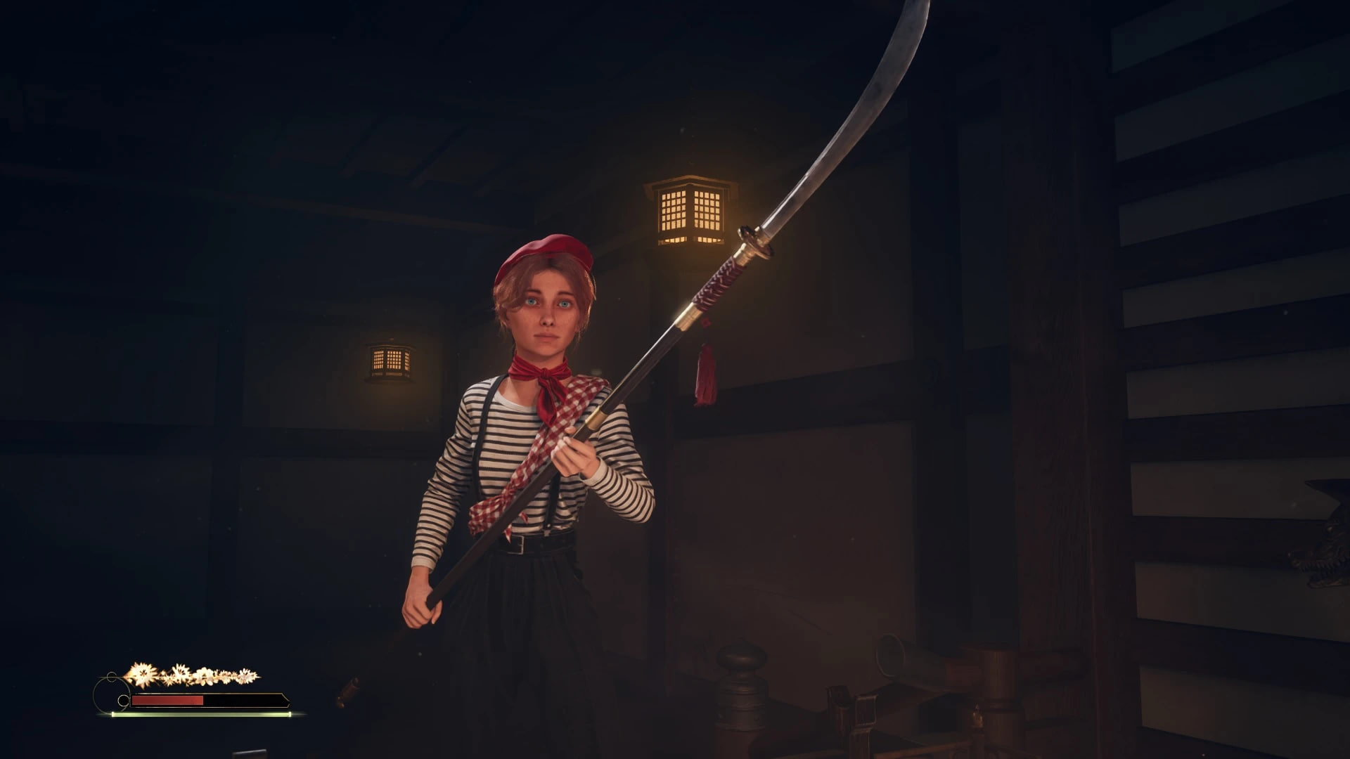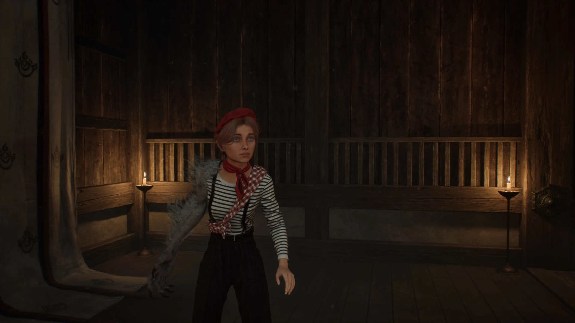 Наряд состоит из классической тельняшки (лонгслива в черно-белую полоску) и черных брюк с высокой талией, которые поддерживаются подтяжками. Образ дополнен красным шейным платком в мелкую клетку и ярко-красным беретом. Замена затрагивает не только одежду: стандартная модель головы и прическа Хинако уступают место образу Маэль с рыжими волосами, собранными в хвост, и выразительными голубыми глазами.