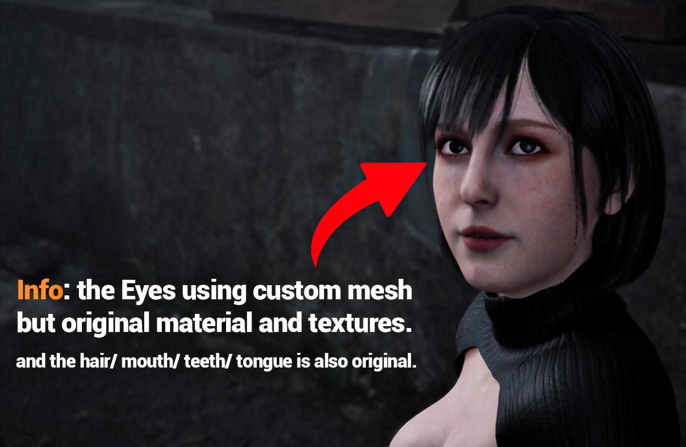 Глаза используют кастомный меш (custom mesh), но оригинальные материалы и текстуры. Волосы, рот, зубы и язык также оригинальные.