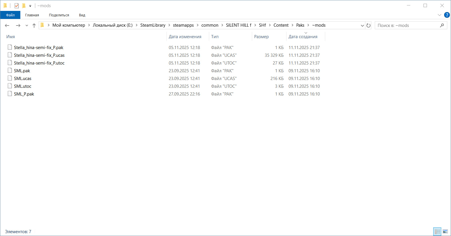 не сюда ❌ E:\SteamLibrary\steamapps\common\SILENT HILL f\SHf\Content\Paks\~mods
