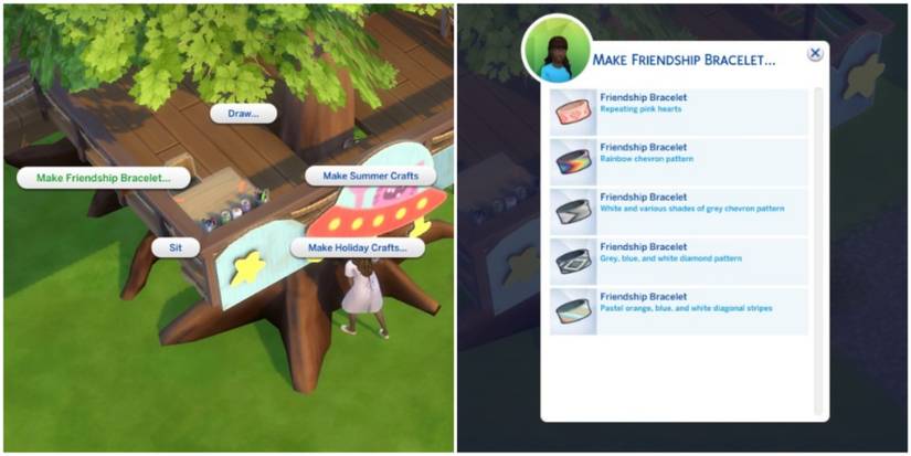 После взаимодействия со столом необходимо выбрать действие «Сделать браслет дружбы». В открывшемся меню игрок решает, какой именно узор будет у украшения. Изготавливать браслеты могут персонажи начиная с детского возраста.