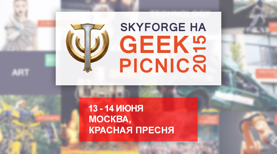 Geek Picnic — это крупный европейский фестиваль искусства, технологий и науки. Организаторы мероприятия собрали на одной площадке самые интересные и необычные технологические экспонаты со всего мира. Посетители смогут побывать в парке роботов и на чемпионате мультикоптеров, увидеть вечернее тесла-шоу и послушать лекции от ведущих российских и мировых экспертов мира технологий. На этом мероприятии вы сможете принять участие в настоящем квесте дополненной реальности, посвященном Skyforge. Для этого вам понадобится лишь специальное приложение — Junaio (iOS, Android). Используя приложение, участники квеста увидят виртуальные образы, а благодаря технологии дополненной реальности смогут сфотографироваться с игровым оружием. Активных игроков ждут сувениры! Чтобы получить приз, нужно всего лишь опубликовать сделанное в рамках квеста фото с хештегом #skyforge в соцсети.