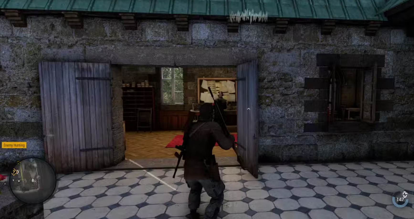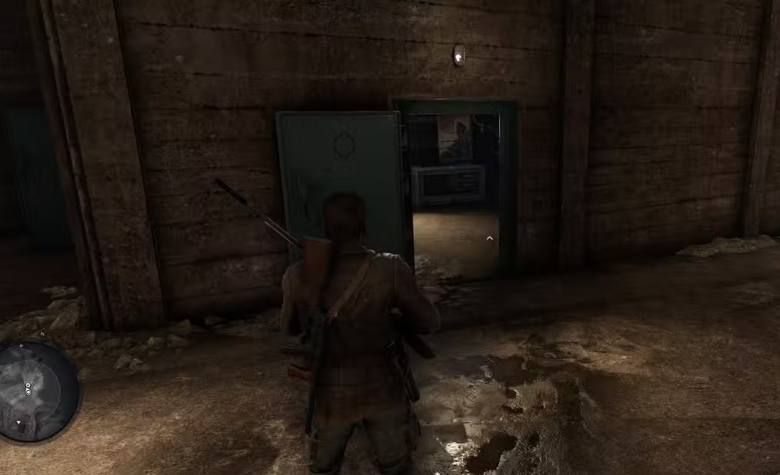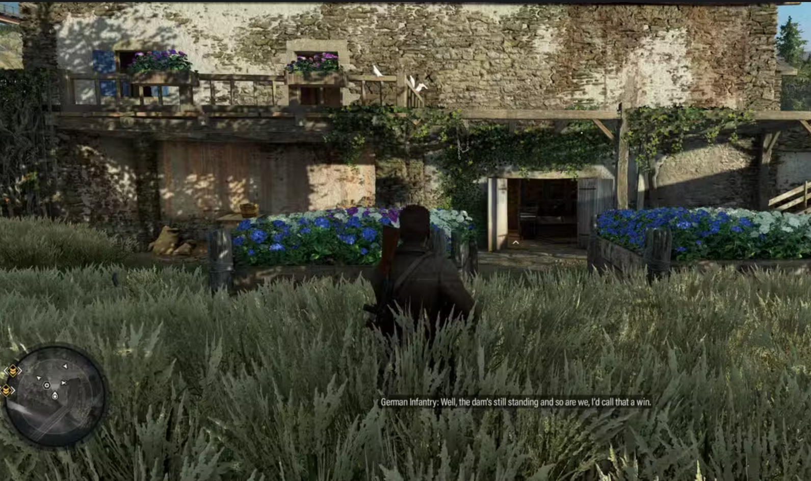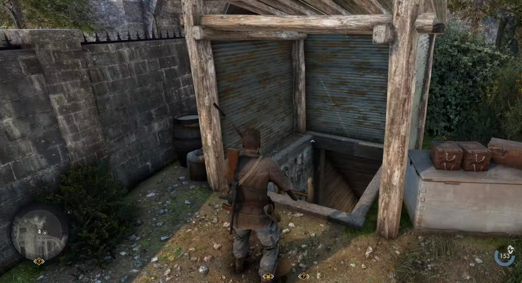 В центре карты найдите заброшенное здание сопротивления. Взберитесь по лозе, перейдите по карнизу на верхний этаж, затем спуститесь в сарай.