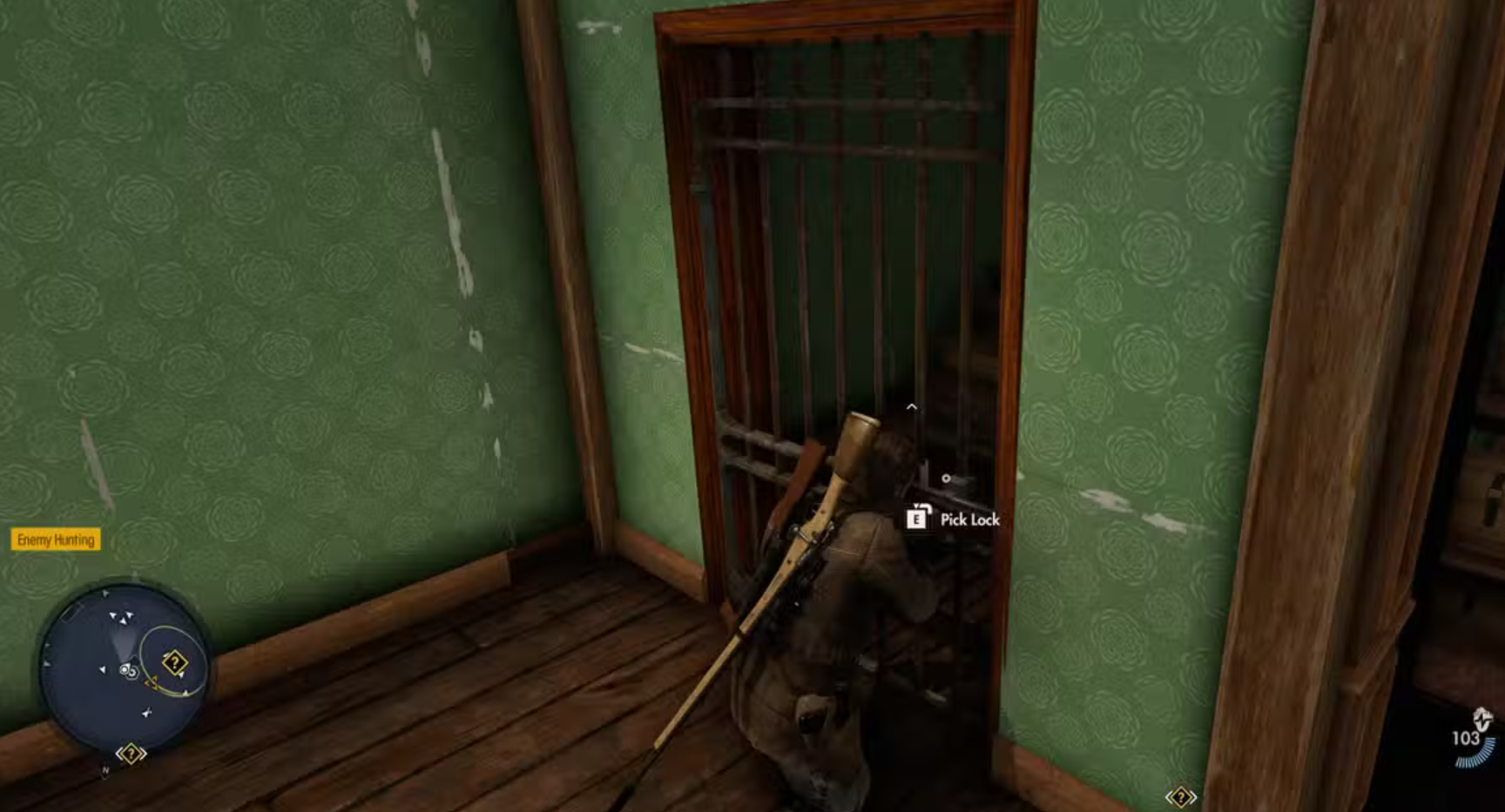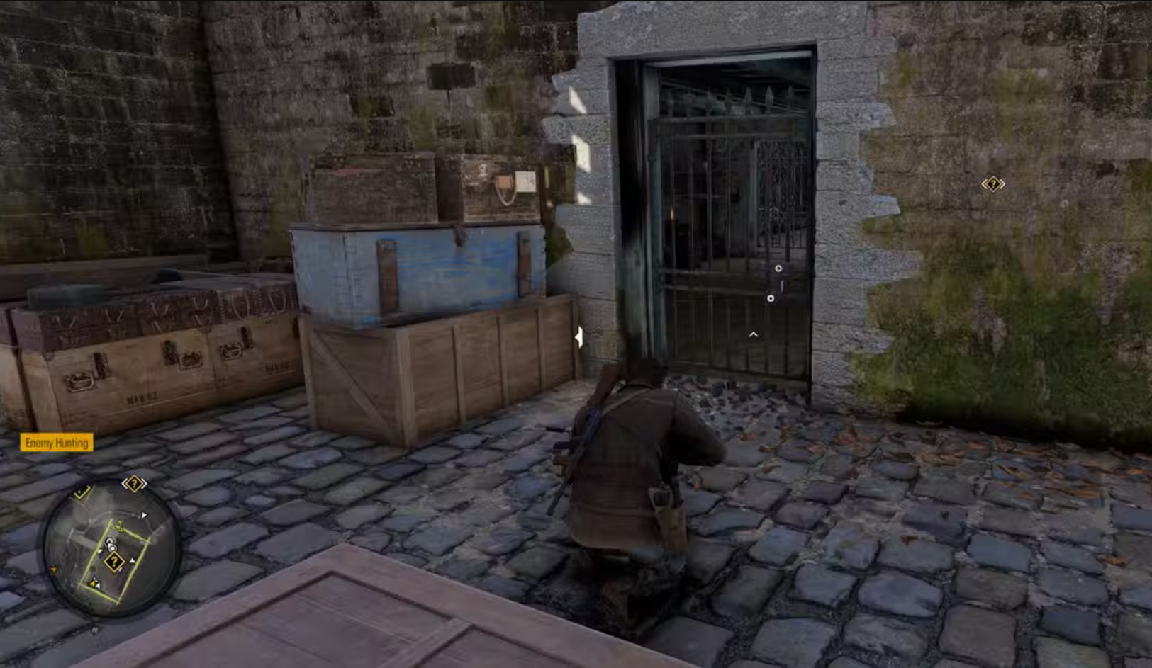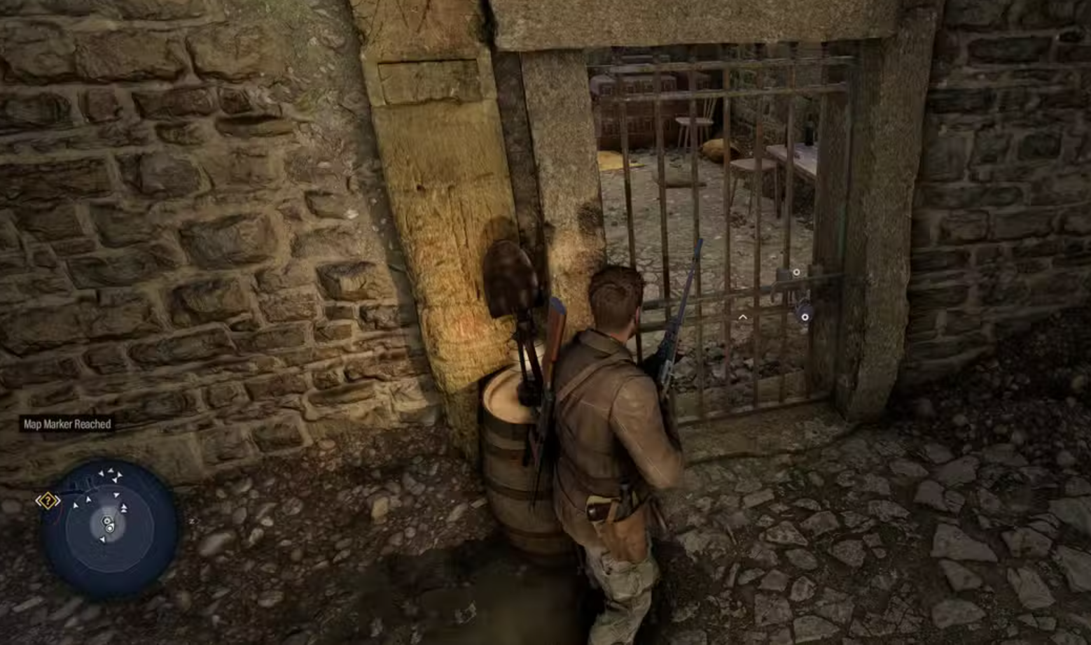 За зданием в левом нижнем углу карты есть лестница на второй этаж. Убейте или обойдите солдата и агента гестапо, затем взломайте замок на воротах.