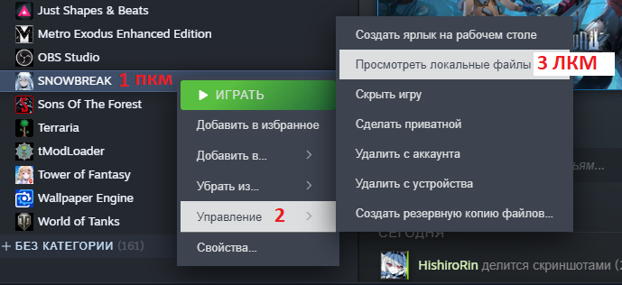 2. Кликаем ПКМ по игре - Управление - Просмотреть локальные файлы.