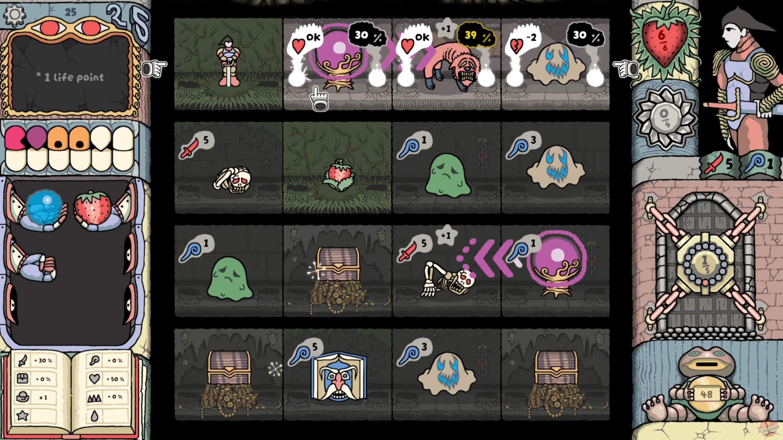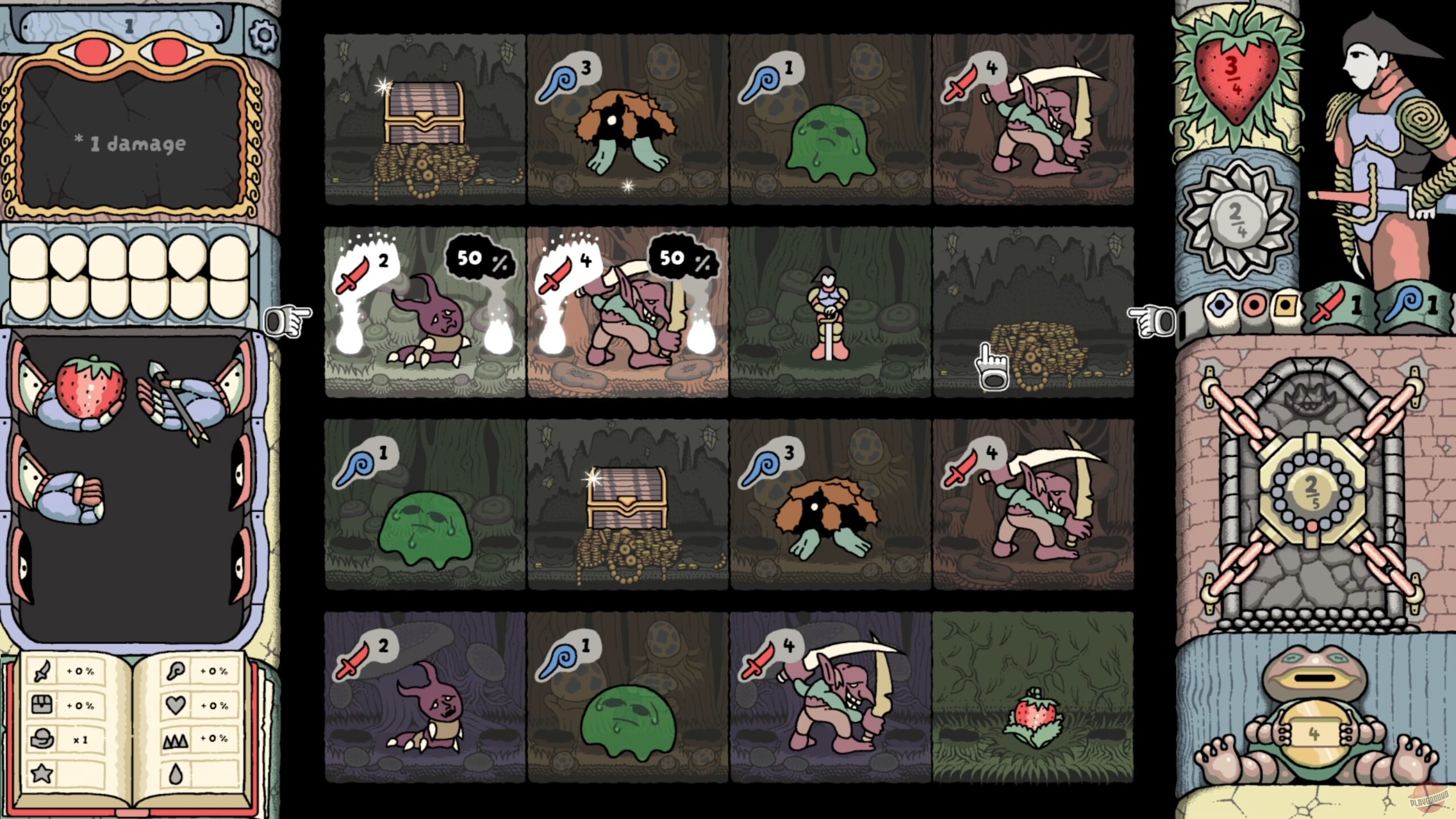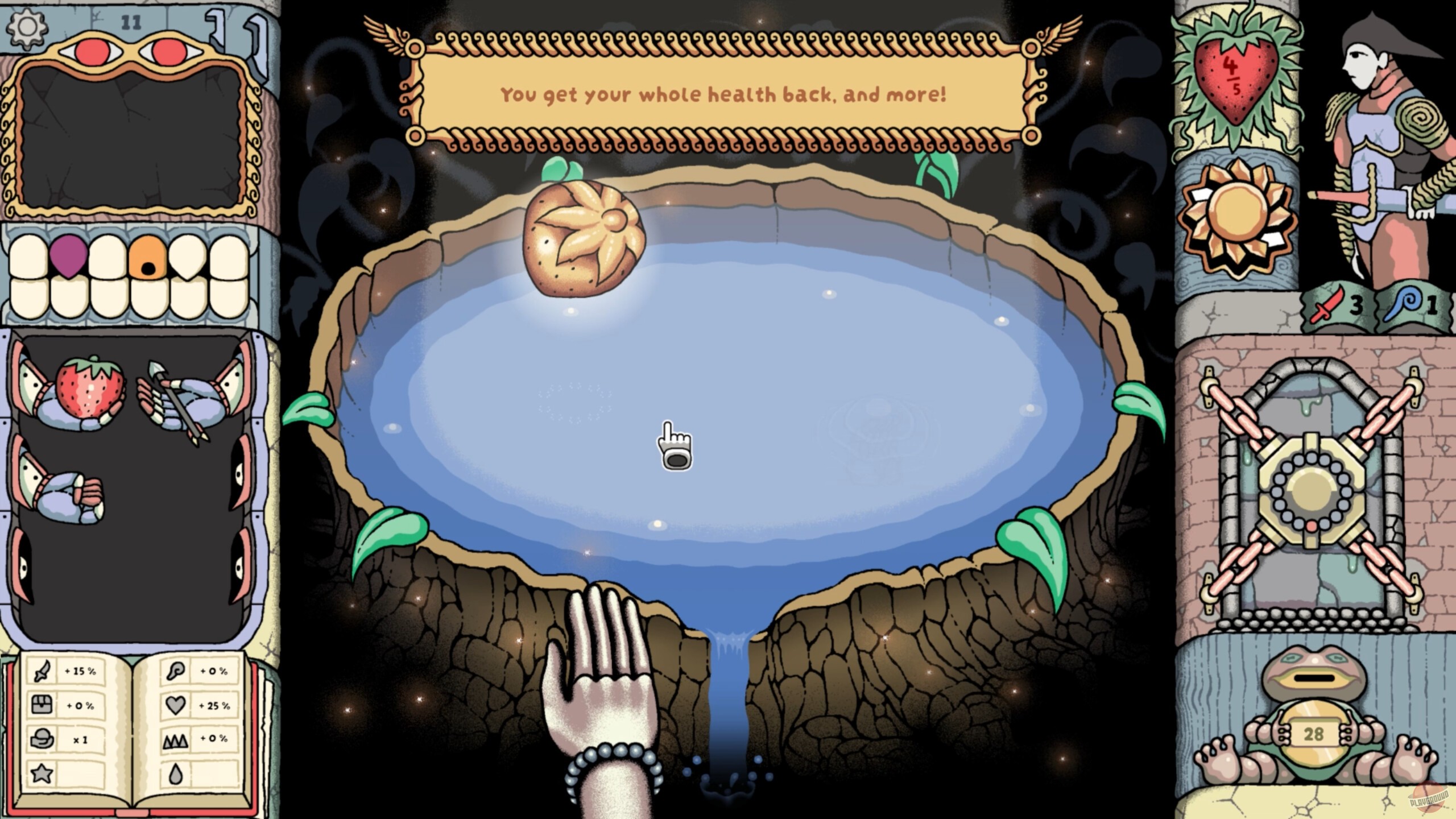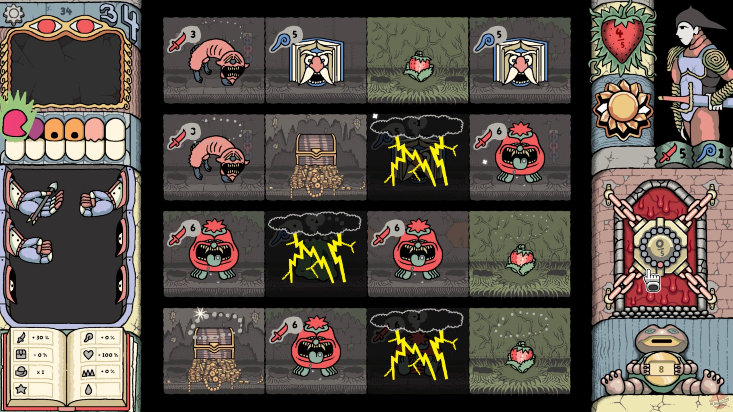 Игра в жанре «роуглайт», только вместо привычных процедурно генерируемых уровней здесь на каждом экране игрок выбирает одну из четырёх дверей, не зная заранее, что за ними скрывается. А главная механика, которую разработчики, видимо, считают своим коронным изобретением — «проклятые зубы», дающие защиту от определённых типов опасностей. По факту, это просто переименованные перки с минусами, какие можно найти в десятках других игр. А так всё достаточно стандартно для жанра — исследуй, качайся, умирай, начинай сначала.