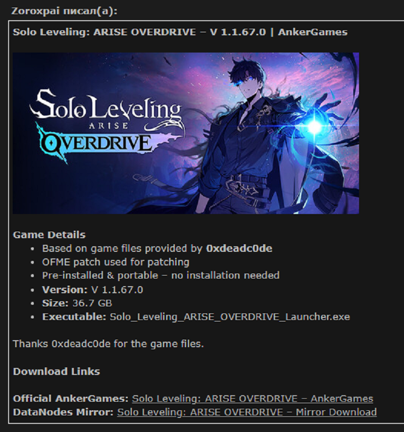 Как стало известно, пользователь 0xdeadc0de выпустил онлайн-фикс (взлом) для Solo Leveling: Arise Overdrive, который позволяет пиратам бесплатно насладиться игрой.