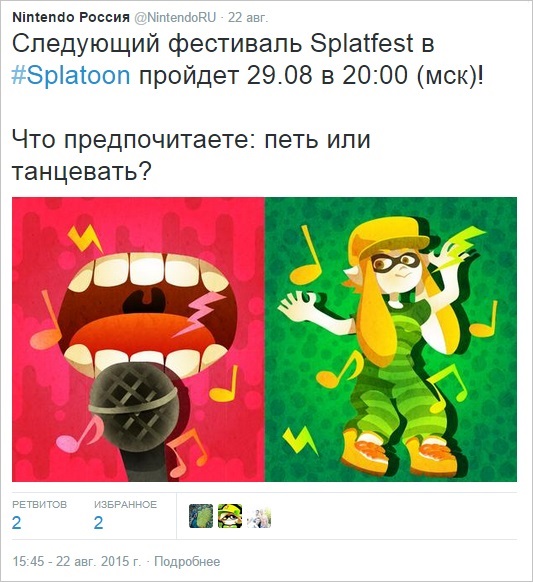 Новая тема для стычек инклингов – «пение против танцев». Любители исполнять песни будут выяснять отношения с теми, кто предпочитает делать ритмичные движения под музыку. Тем временем в Америке представлена куда более интересная тема - «Автоботы против Десептиконов», жалко, что нам не доведётся выяснить, кто же из трансформеров круче. Но, надо признаться, японцам с темой повезло еще меньше, ведь в Японии последний Splatfest уже завершился. Тема была, мягко говоря, не очень крутой – «кузнечики против муравьев». Уверенную победу одержали кузнечики с огромным отрывом в 22%.