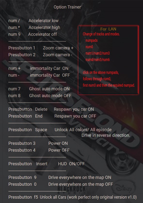 Нажмите кнопку f5 Разблокировать все авто (Работает правильно только на оригинальной версии v1.0)