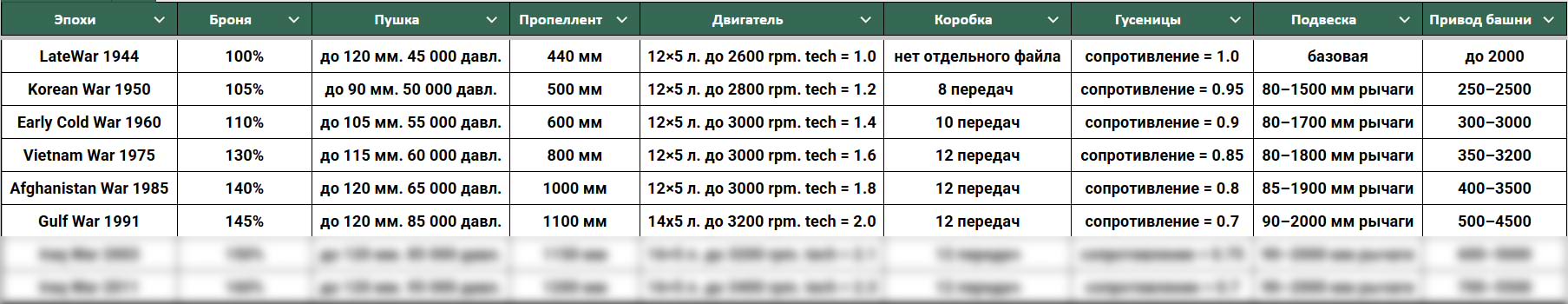 Если в LateWar (1944) доминировали тяжёлые монстры вроде «Тигра II» и ИС-2 с огромными пушками, то через Корею (1950), раннюю Холодную войну (1960) и Вьетнам (1975) танки шаг за шагом эволюционировали в подвижные и технологичные машины, достигнув 1991 года.