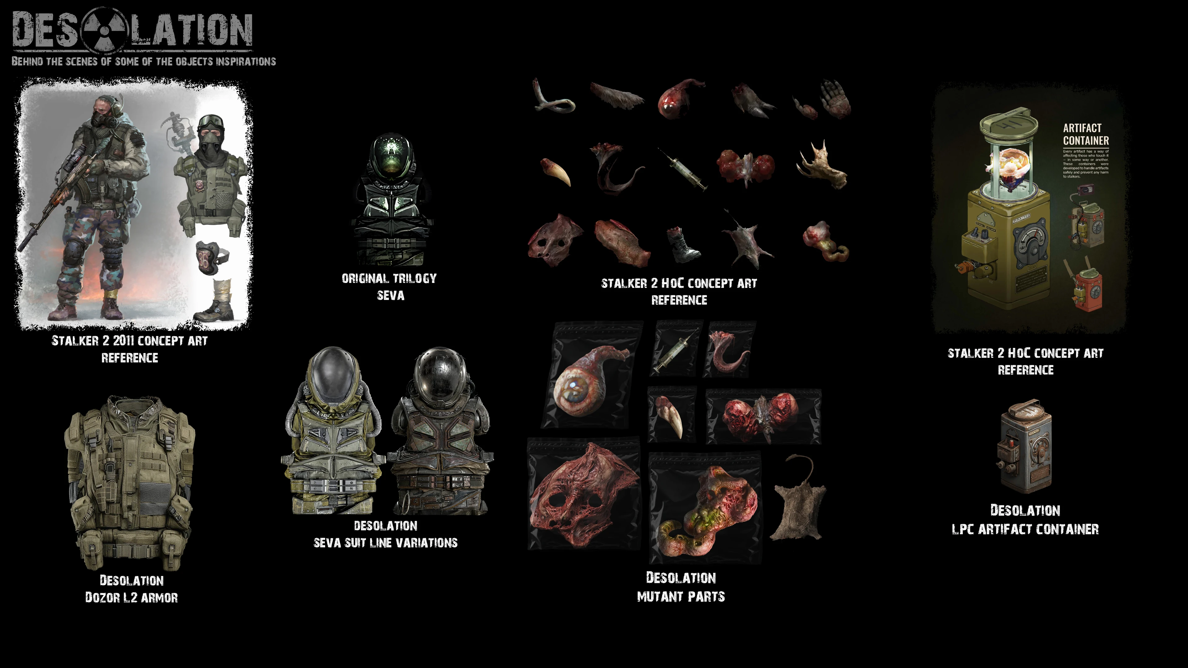 Помимо хардкорной механики выживания в Desolation появится множество новых возможностей, подходов к привычным вещам по мере развития мода. Цель - создать реконструкцию, в которой Зона станет существом, которое будет безжалостно наказывать всех, кто в ней находится, за их ошибки, гнуть и ломать их при каждом удобном случае, но при этом вознаграждать любопытных и умных сталкеров в моменты своей милости. И игровое поле станет равным как для игрока, так и для других персонажей.
