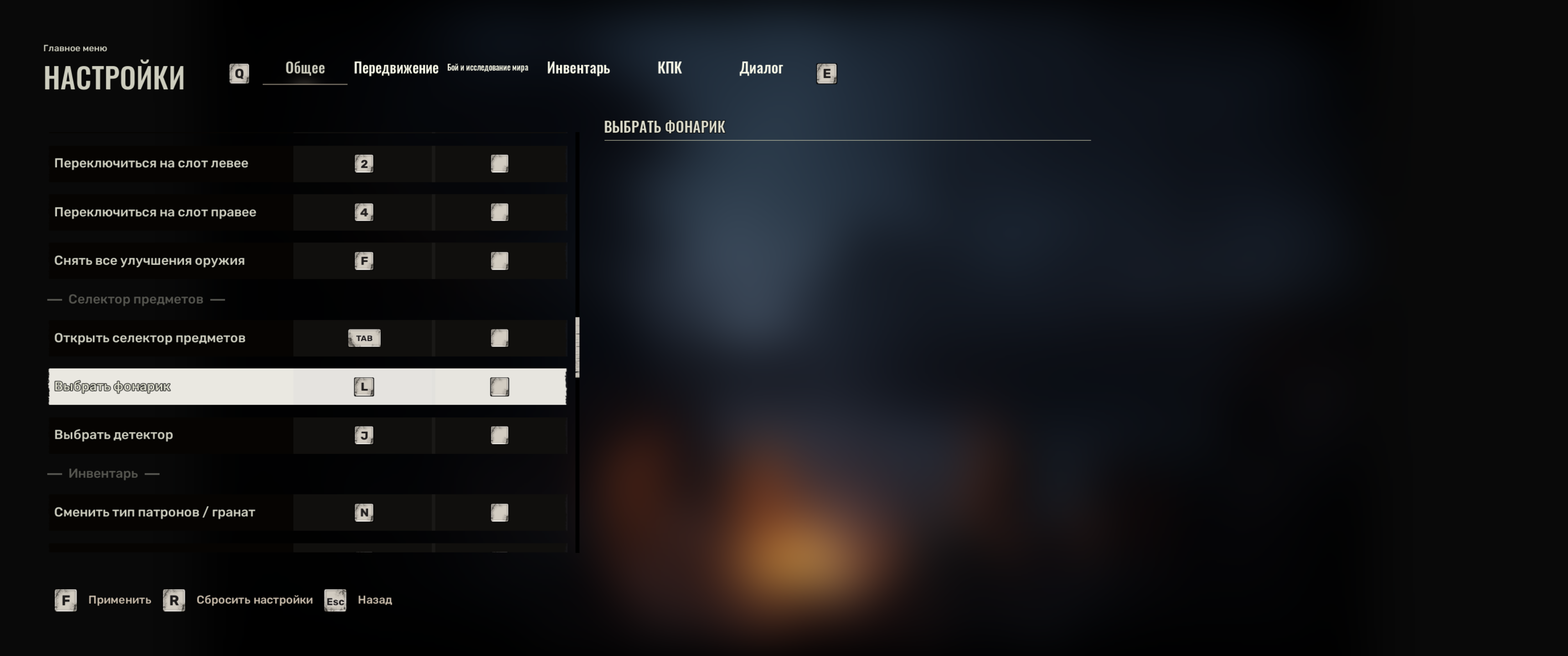 Всем привет. РЕШИЛ ПРОБЛЕМУ назначения фонарика на F , и также исправил некорректную работу колесо мыши (а то при выборе оружия было наоборот, вперёд крутил - а оружие предидущее выбиралось). Клавишу удара прикладом менять/исправлять не стал, меня и так устроило. Всё остальные/нужные кнопки назначаются в меню игры без проблем.