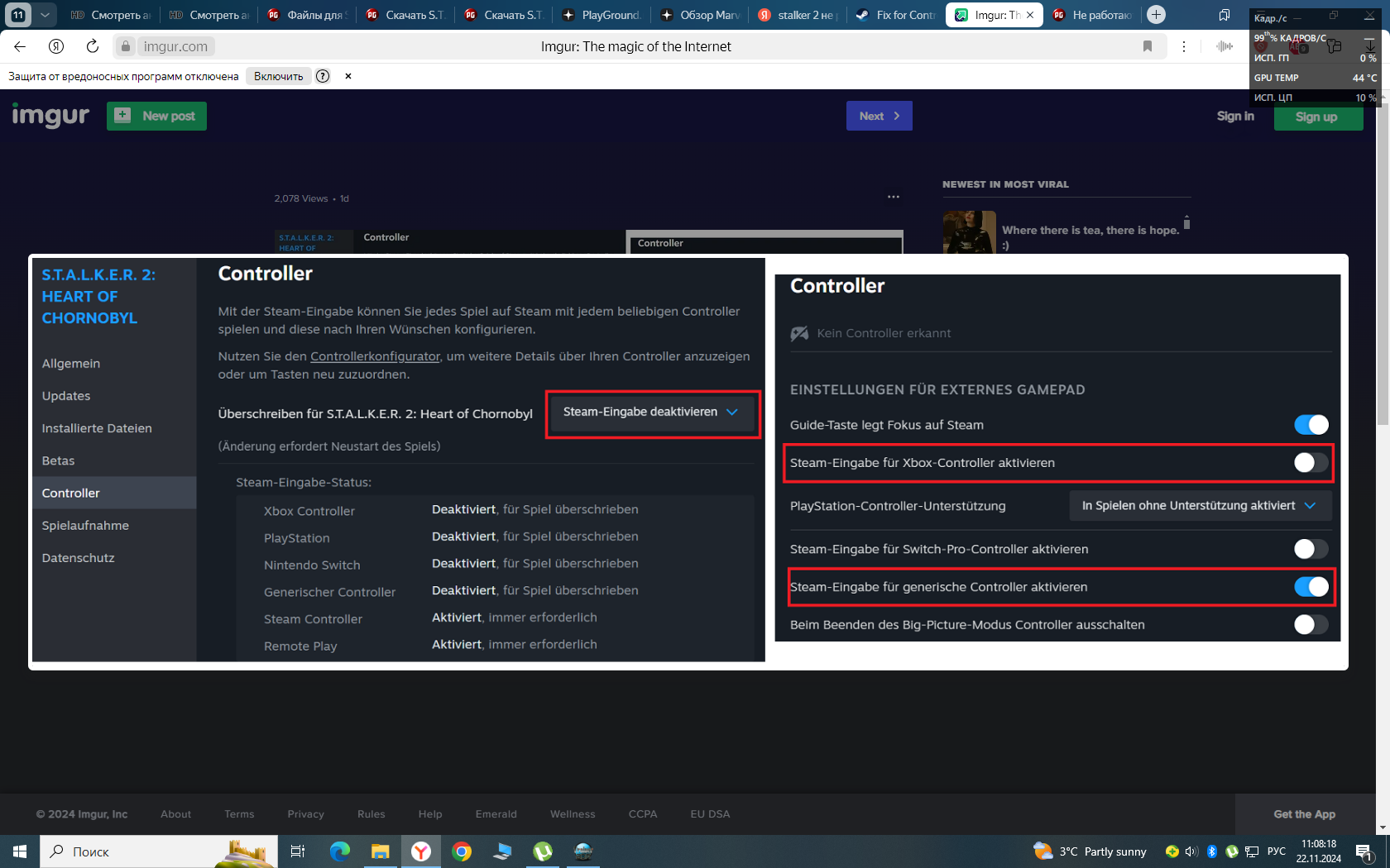 У меня геймпад xbox x/s или как то так. Новый короче. Не видит его сталкер даже в настройках игры. Только клава мышь