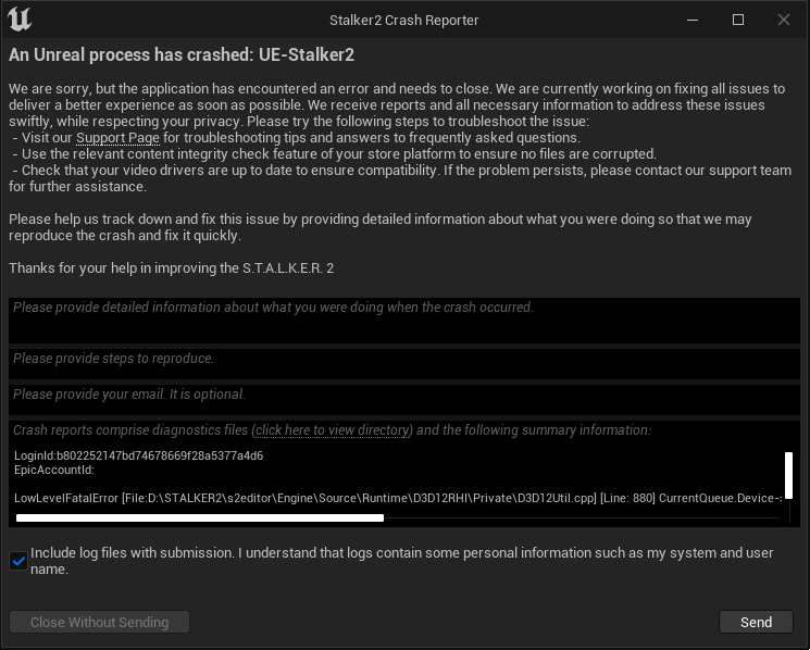 LowLevelFatalError [File:D:\STALKER2\s2editor\Engine\Source\Runtime\D3D12RHI\Private\D3D12Util.cpp] [Line: 880] CurrentQueue.Device->GetDevice()->GetDeviceRemovedReason() failed at D:\STALKER2\s2editor\Engine\Source\Runtime\D3D12RHI\Private\D3D12Submission.cpp:910 with error 887A0006