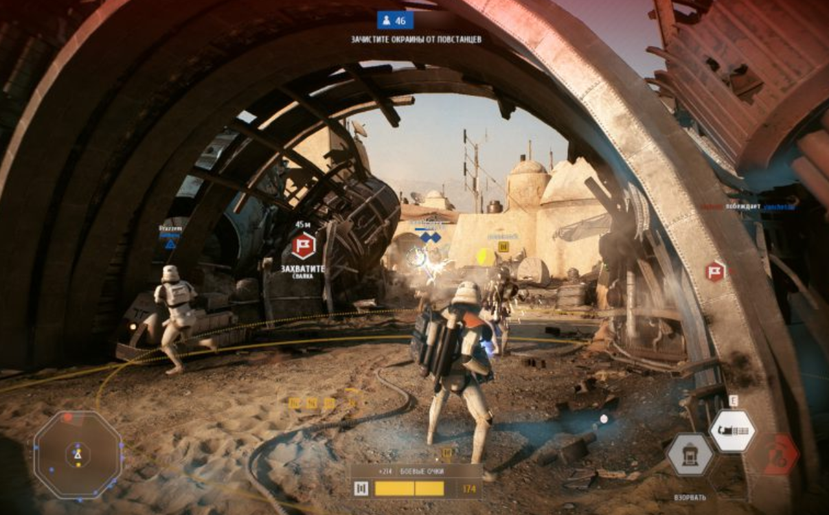 Самый массовый по числу игроков, и, пожалуй, самый интересный режим – Галактические битвы, пришедшие на смену Атаке шагоходов. Нет, сопровождать AT-AT вам все равно придется, в том числе и на так любимом игроками Хоте, но часть заданий обойдется и без гигантской боевой машины. Как обычно – выполняем боевые задачи, захватывая объекты или удерживая их, и продвигаемся дальше по карте в случае успешного штурма. Если обороняющаяся сторона проигрывает все этапы в самый последний момент – бой может затянуться на двадцать минут. У нападающей стороны вместо таймера есть счетчик резервов, когда он добежит до нуля, матч будет проигран.
