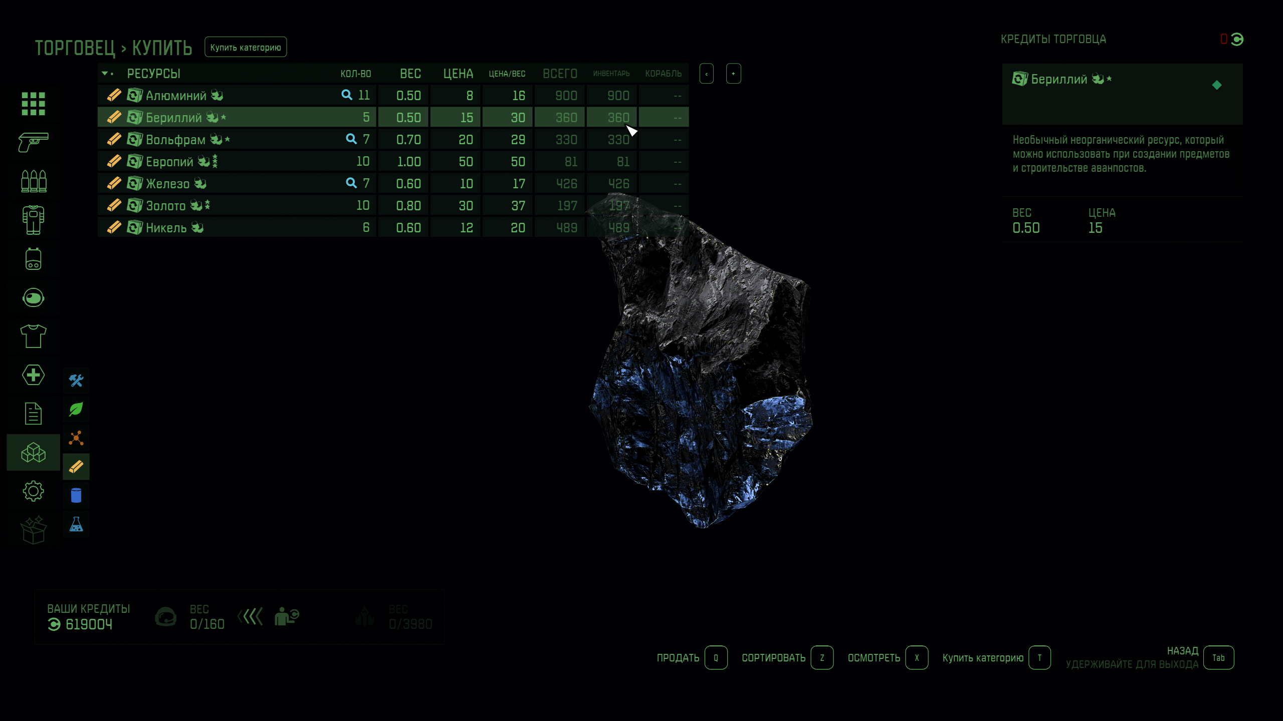 Также можно поставить мод на увеличение дистанции доступа к трюму, в этом случае можно прямо из меню торговли заглянуть в раздел продажи с корабля, и там посмотреть количество ресурса.