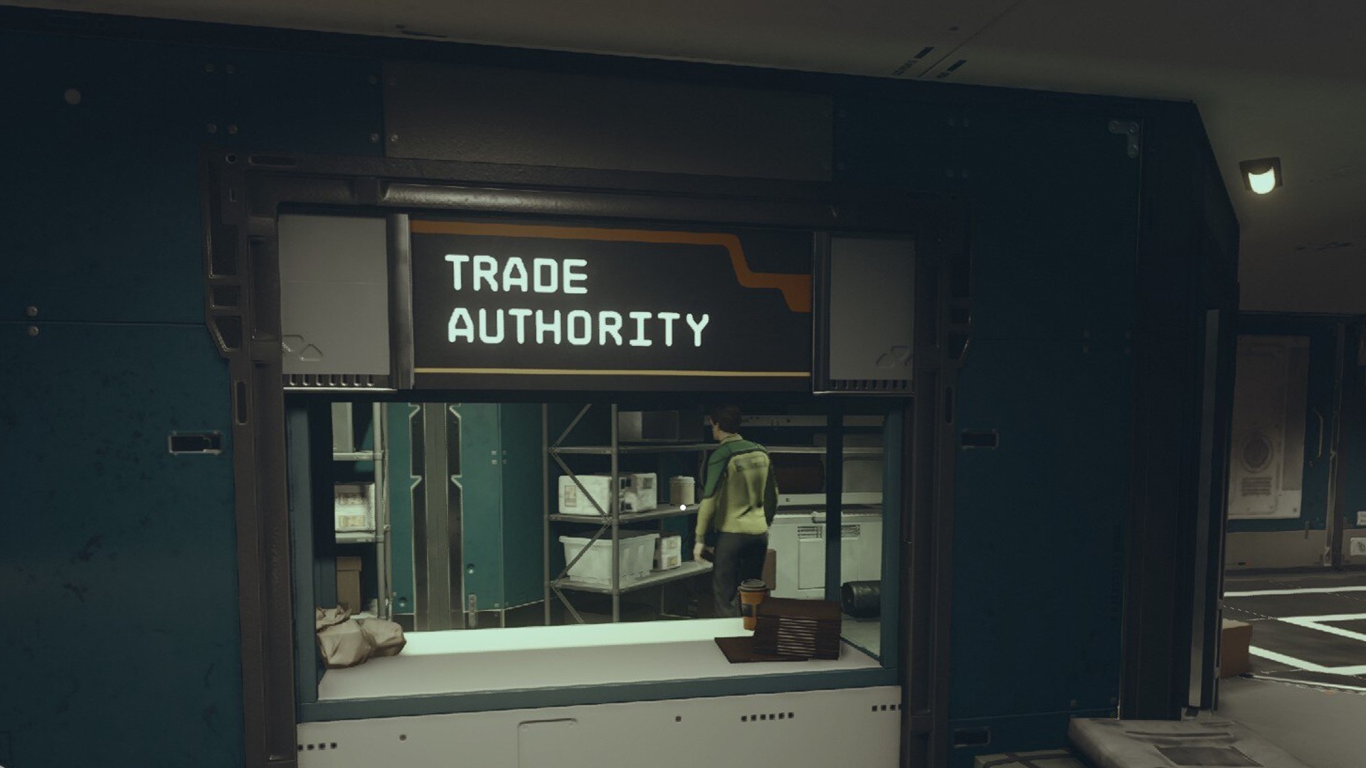 Вы можете продавать нелегальный груз через организацию Trade Authority. Одна из её точек находится на станции The Den в системе Wolf. Внутри локации вас будет ожидать торговец в лавке — он изображён на скриншоте ниже.