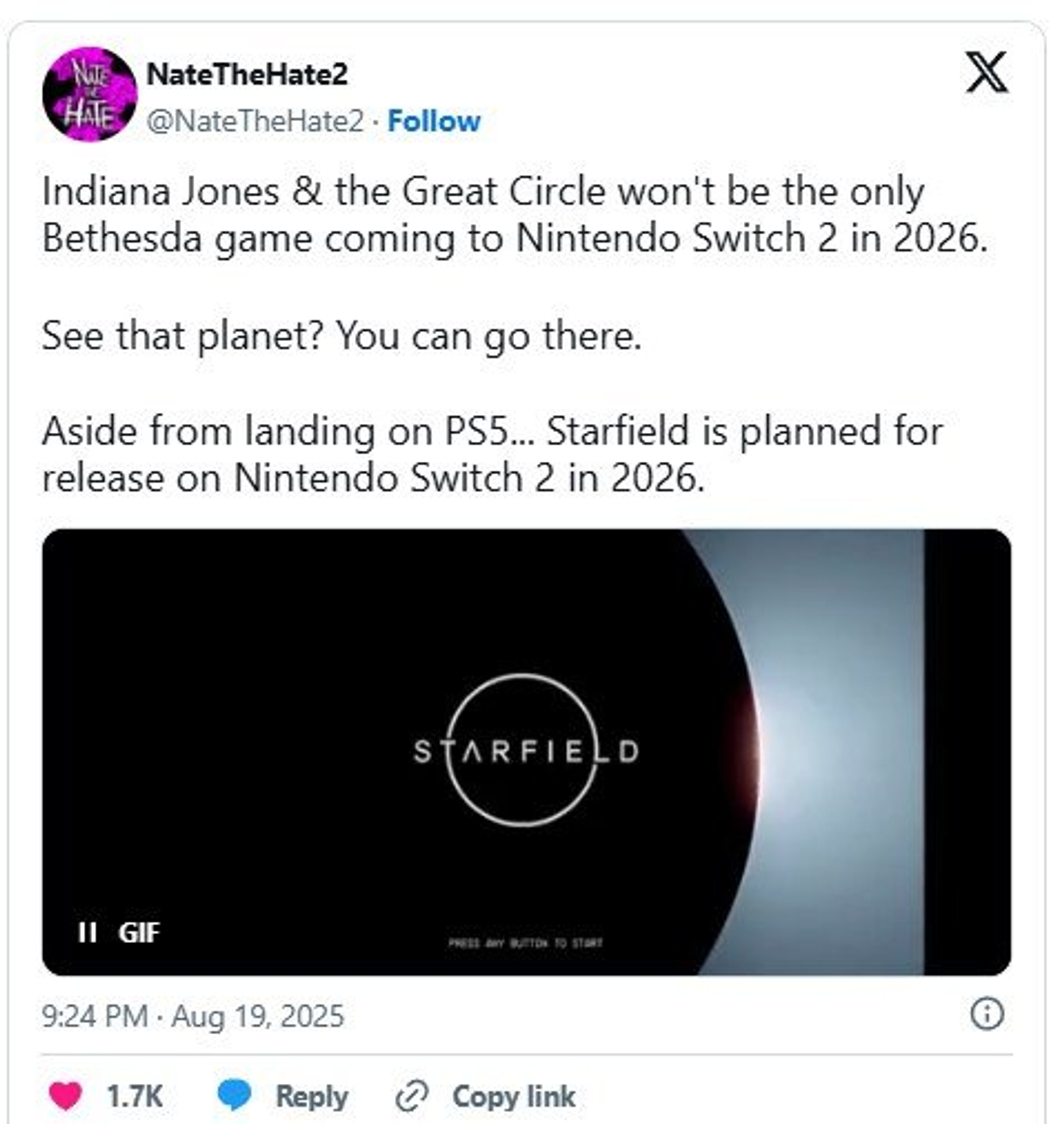 Известный инсайдер NateDrake, он же Nate the Hate, который практически никогда не ошибается, опубликовал в социальных сетях пост с утверждением, что Starfield выйдет в следующем году не только на PS5, но и на Switch 2.