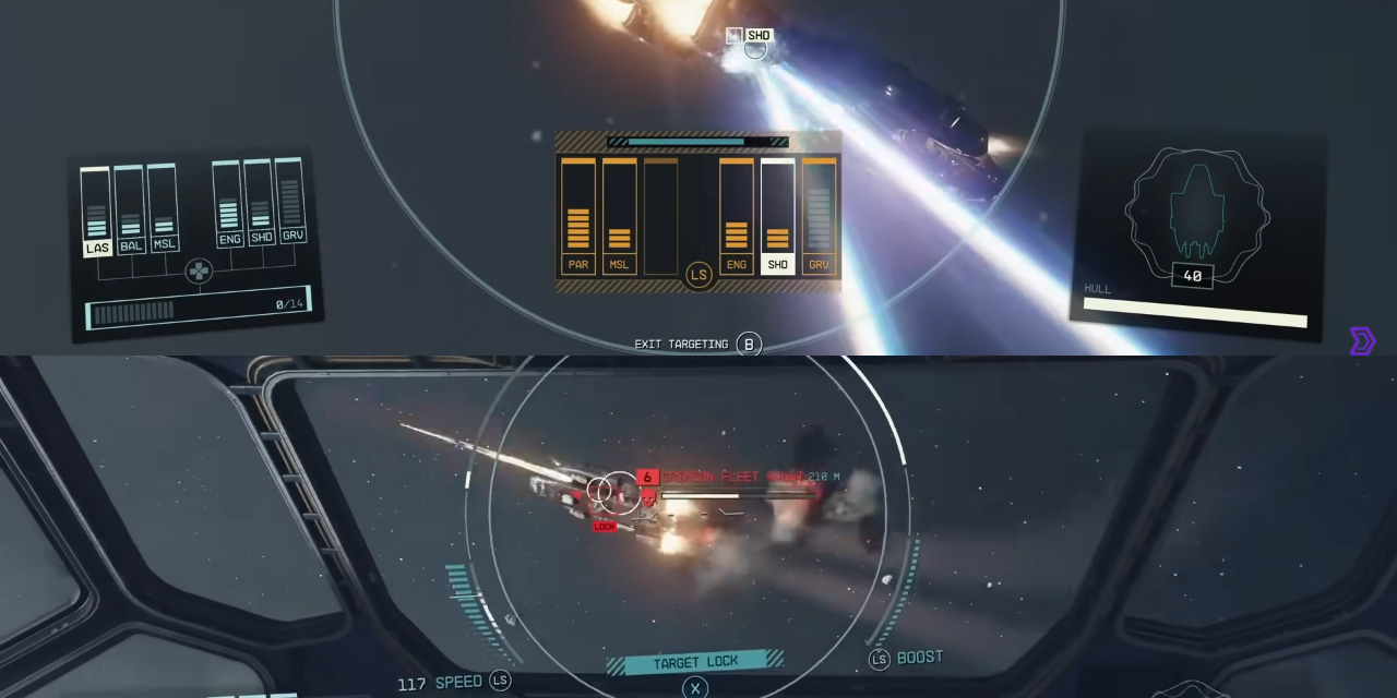 В моменте перестрелки с кораблем Crimson Fleet, той самой где нам показывают прицельный отстрел модулей, мы видим как игрок разбивает щиты цели сначала лазером, а затем расстреливает корпус баллистическими зарядами. На это указывают скачущие полоски задержки стрельбы. Сначала лазеров, затем баллистических орудий.