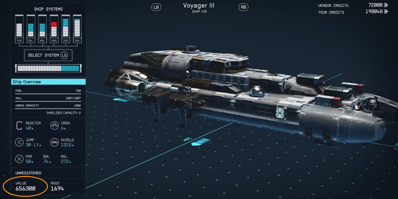 Самое дорогое что пока замечено в презентации это вот этот огромный корабль достаточно грозного вида, под названием Voyager III. Его размеры становятся понятны, если присмотреться к просторному мостику в верхней части. Стоит это чудо техники целых 656.300 кредитов. Для сравнения, начальный корабль игрока стоит 7.000 кредитов, а одна из непростых винтовок в эпизоде с оружием стоит 12.000 кредитов.