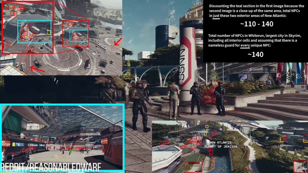 - В районе космопорта Новой Атлантиды уже насчитали 120-140 персонажей только на улице, без учета помещений. В крупнейшем городе Скайрима - Вайтране было всего 140 персонажей включая стражу, и всех NPC в помещениях