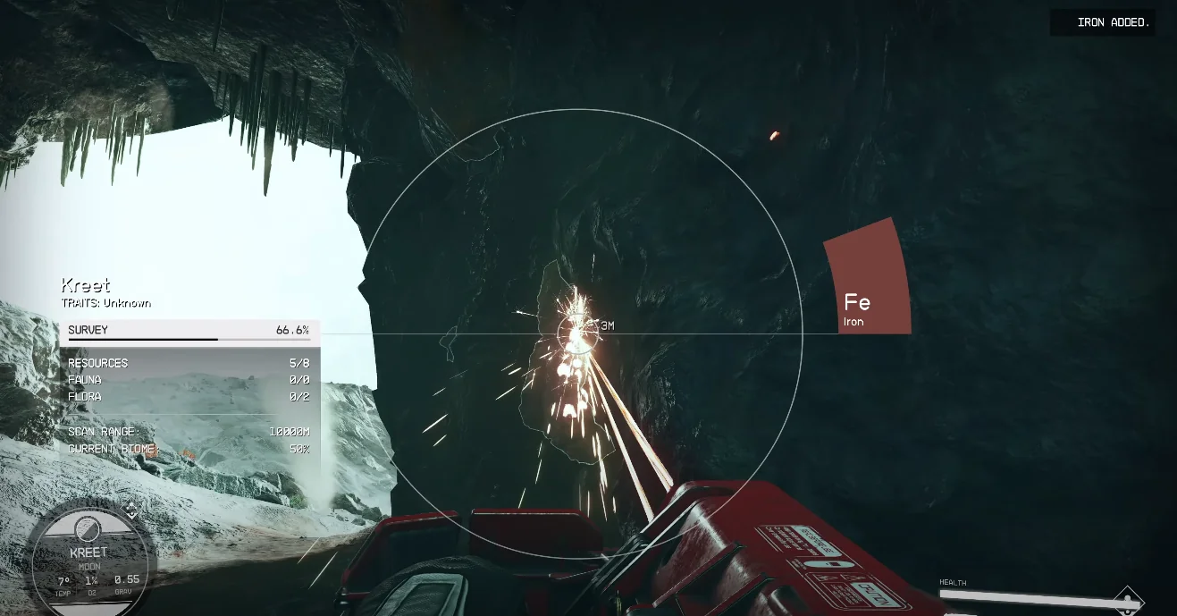 Что же такое Argos Extractors? Скорее всего это горнодобывающая компания, и, возможно, именно там вы научились добывать минералы с помощью шахтного лазера, что мы и видим на отметке 3:33. HUD игрока показывает планетарный сканер, когда он впервые сходит с корабля на отметке 2:45. Это соответствует целям горнодобывающей операции: обнаружить, какие ресурсы содержит планета.